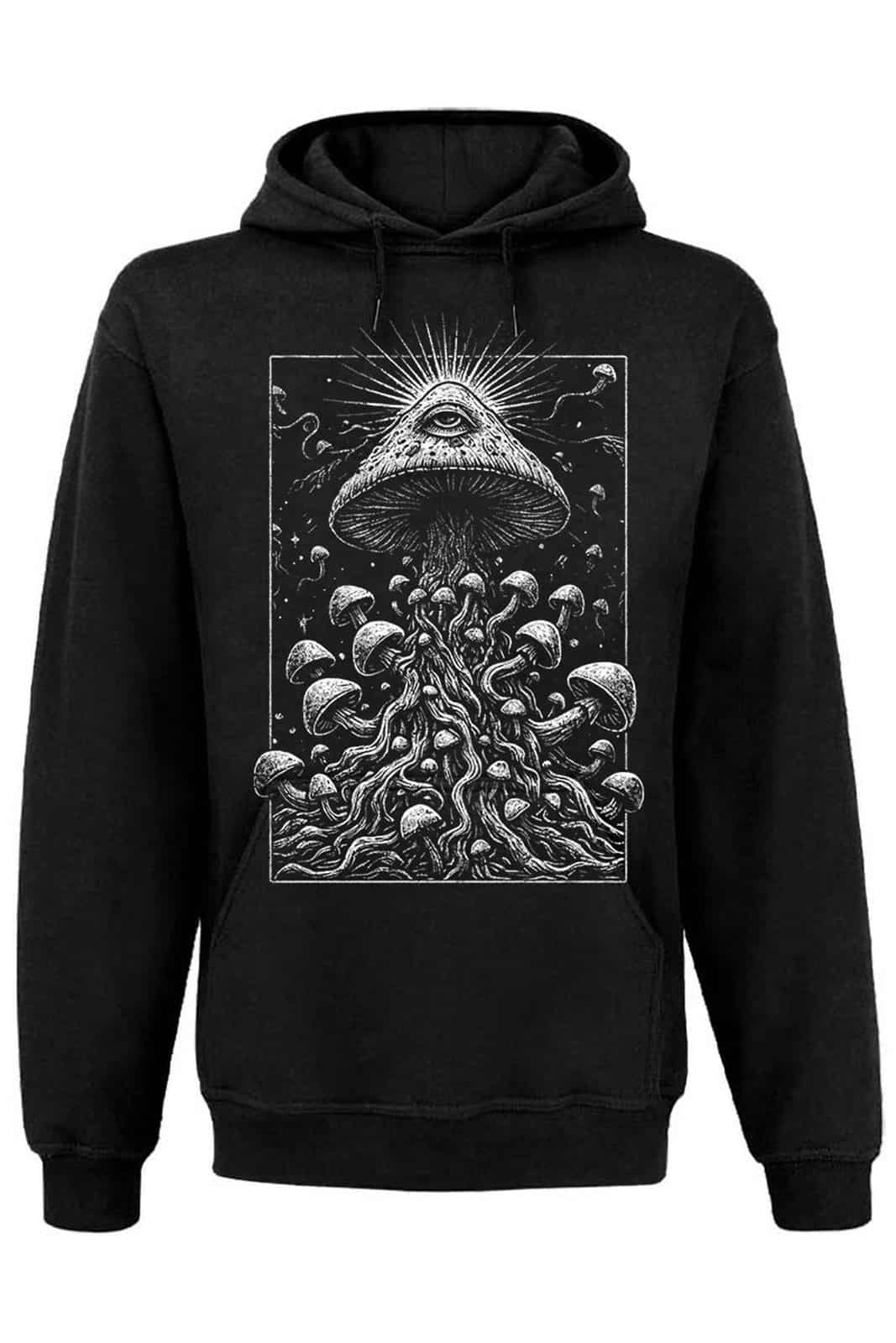 Das Motiv Magic Mush entfaltet auf der Rückseite eine visionäre, mystische Szene: Ein gigantischer Pilz mit allsehendem Auge erhebt sich wie ein okkultes Orakel, während aus seinem Stamm unzählige Pilze und wurzelartige Strukturen emporwachsen. Feine Linien und dichte Schattierungen erzeugen einen psychedelischen Strudel aus Natur, Magie und Symbolik – perfekt für alle, die dunkle Ästhetik mit einer Prise kosmischer Weirdness lieben.