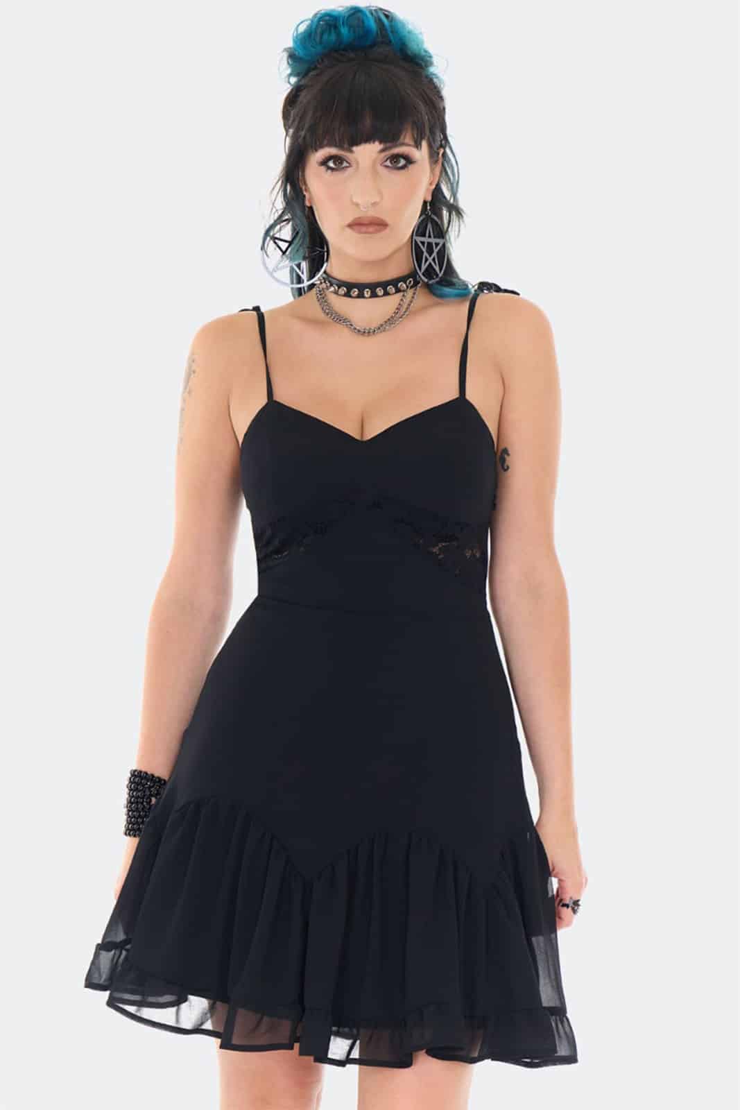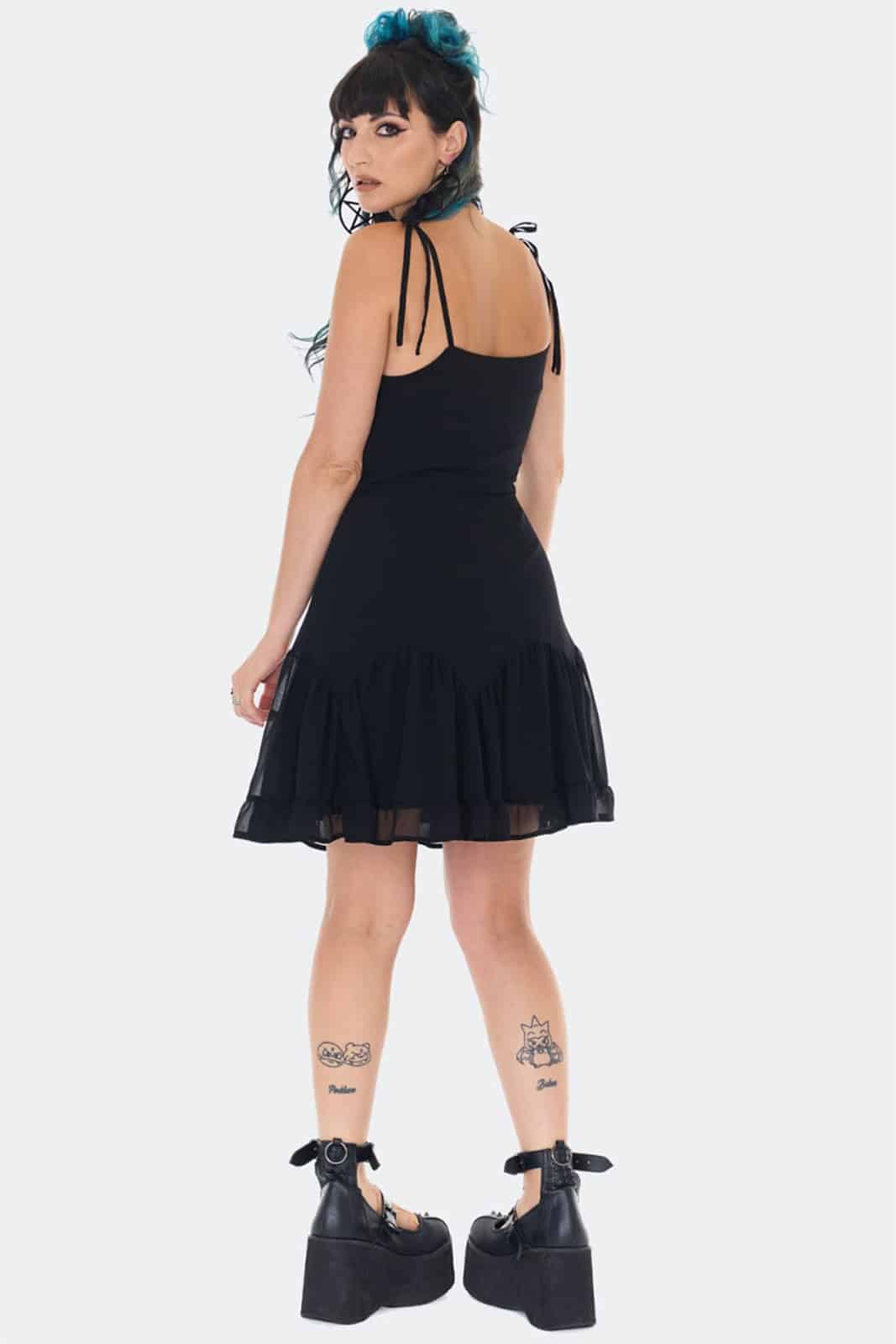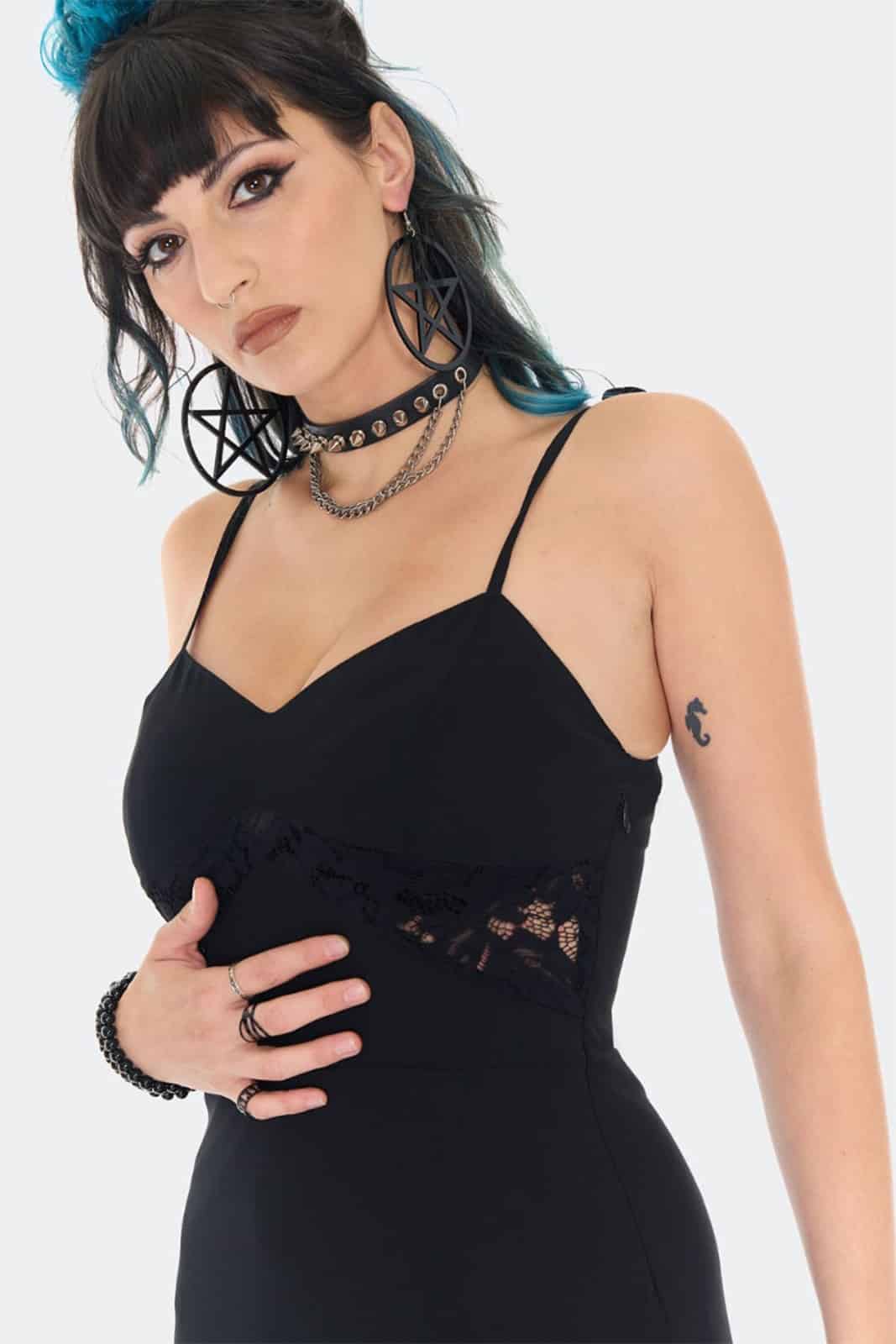Minimalistisch, verführerisch und mit dunkler Eleganz – „Nightshade Whisper“ spielt mit Kontrasten aus glatter Silhouette und feinen Details. Die zarten Spitzenelemente und der fließende Volantsaum verleihen dem Look eine geheimnisvolle Leichtigkeit mit subtil rebellischem Charakter.