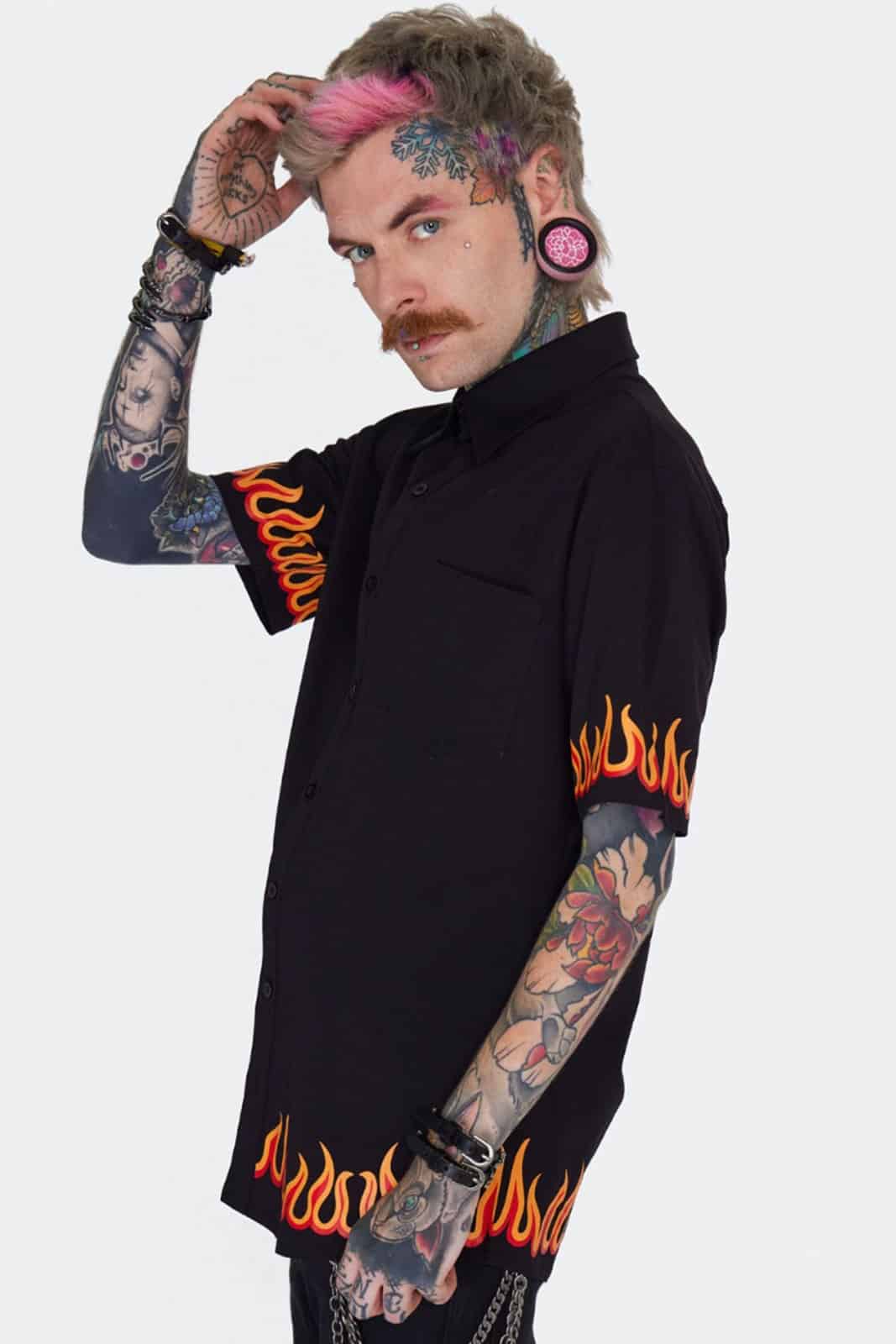 Dieses schwarze Herrenhemd sorgt mit seinem feurigen Flammen-Print in Rot und Orange sofort für Aufsehen. Mit klassischem Kragen, Brusttasche und kurzen Ärmeln bringt es einen auffälligen Rockabilly- und Punk-Touch in jedes Outfit. Verschlossen wird das Hemd mit schwarzen Kunststoffknöpfen – perfekt für Festivals, Konzerte oder als markantes Streetwear-Piece.