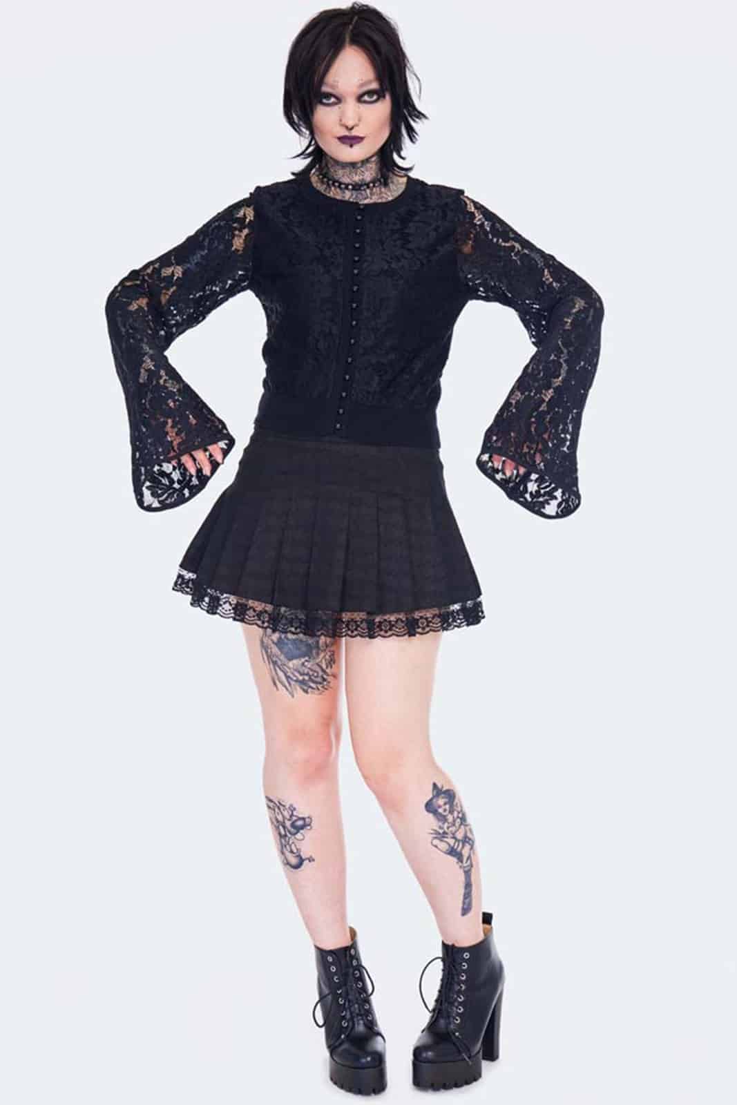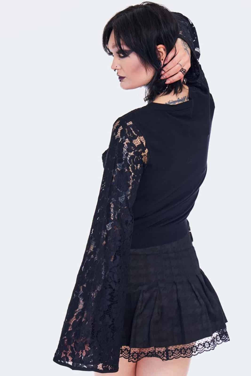 This black cardigan combines Victorian romance with dark elegance. The figure-hugging torso is complemented by wide flared sleeves made of floral lace, which are reminiscent of wings with every movement. A round neckline and full-length button placket give the design a classic silhouette, while the sheer sleeves add a seductive gothic twist. Ideal as a stylish companion over tops or dresses – for all those who don’t want to miss out on the drama of cardigans.