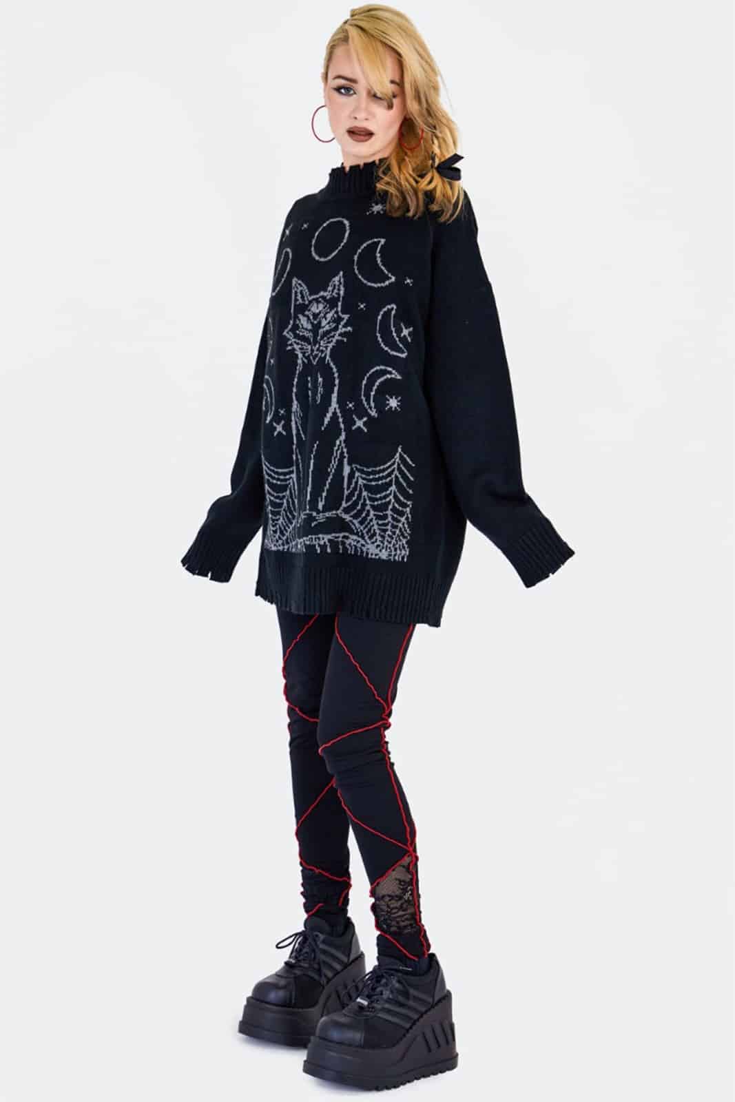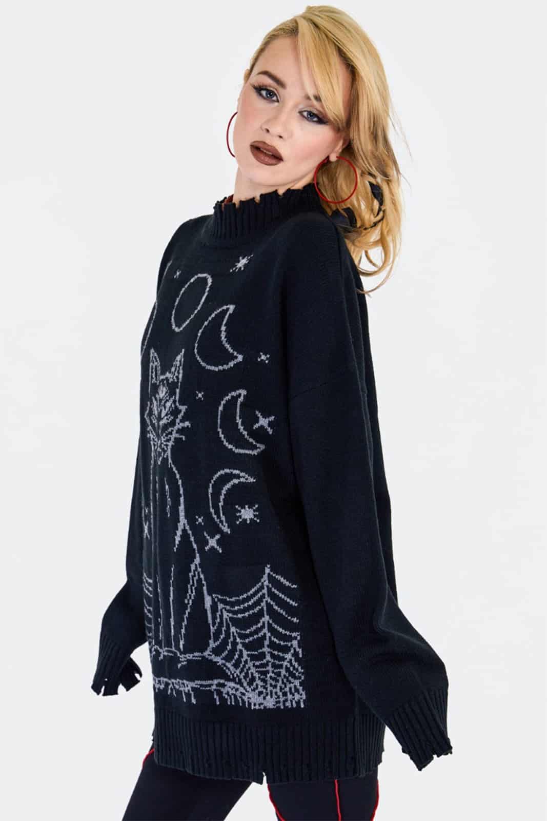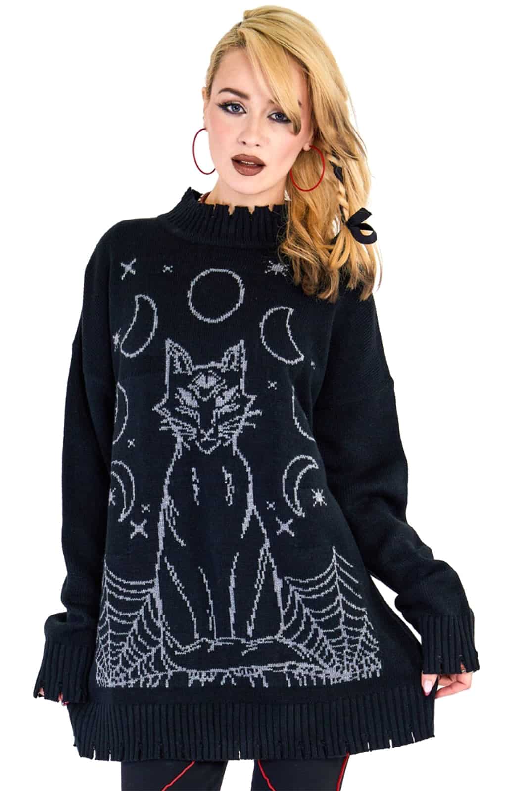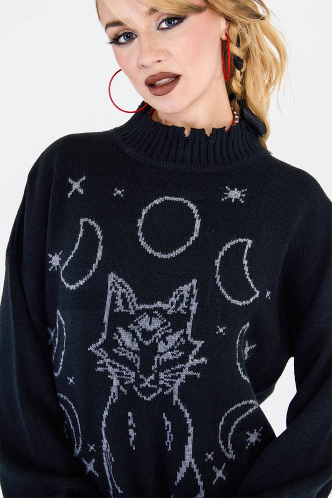 Dieser kuschelige Oversize-Strickpullover bringt mit seinem mystischen Katzenmotiv, den Mondphasen und feinen Spinnennetzen eine geheimnisvolle, okkulte Note in jedes Outfit. Die bewusst distressed gearbeiteten Rippbündchen an Hals, Ärmeln und Saum unterstreichen den lässig-alternativen Look, während die weiche, warme Strickqualität für maximalen Komfort sorgt.