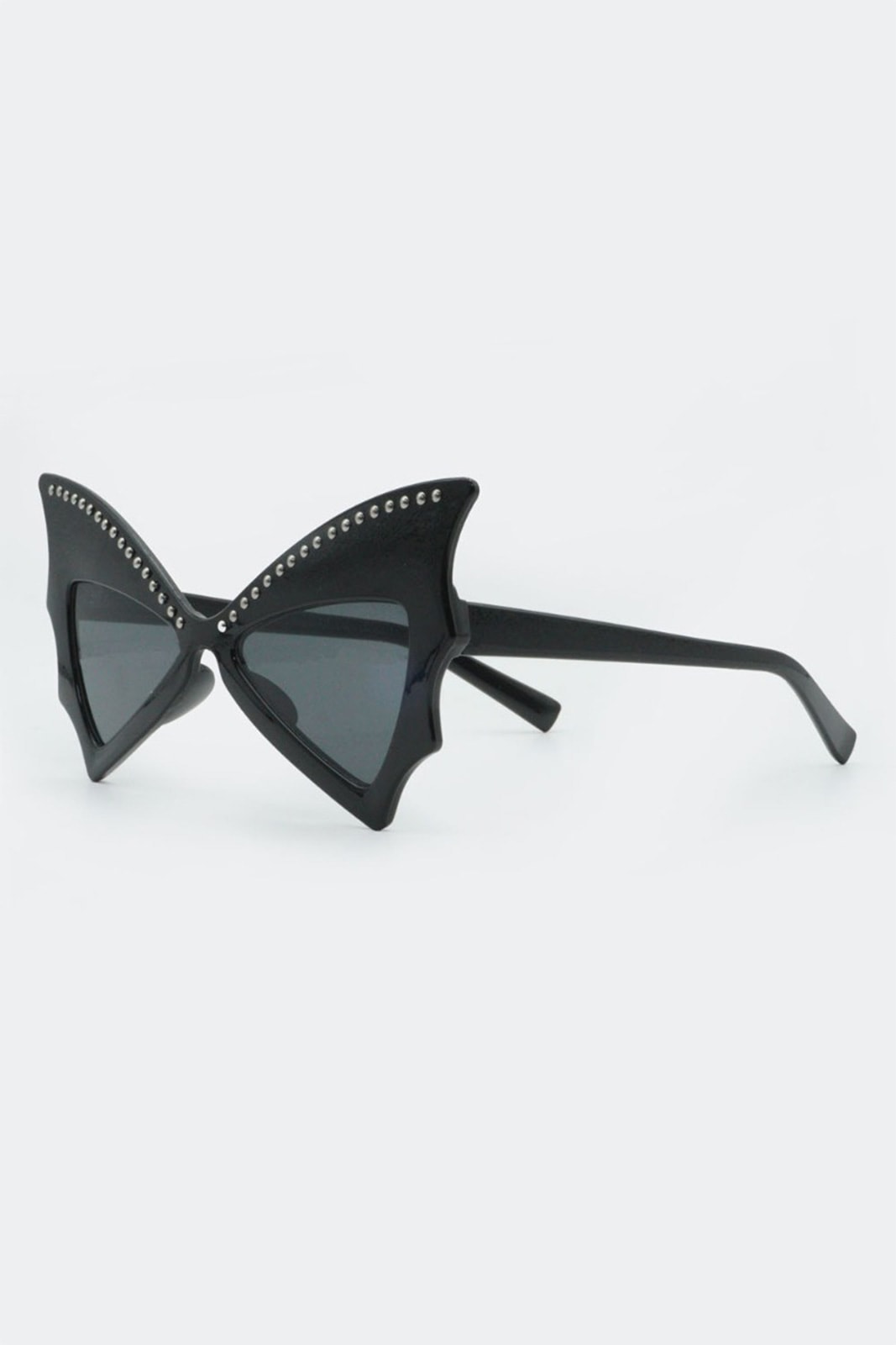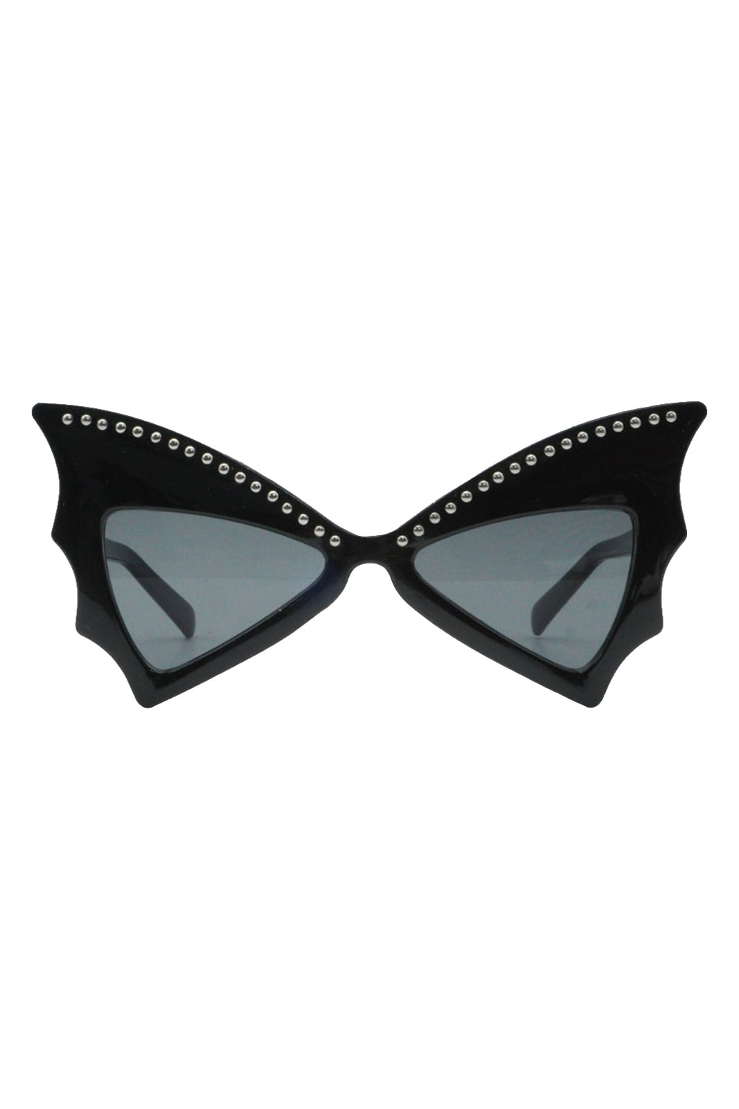 Diese extravagante Sonnenbrille setzt ein klares Statement und vereint düsteren Gothic-Style mit verspielter Batwing-Silhouette. Die schwarzen, getönten Gläser und die silbernen Nieten verleihen ihr einen markanten, edgy Look – perfekt für alle, die ihre Outfits mit einem auffälligen Accessoire abrunden wollen.
