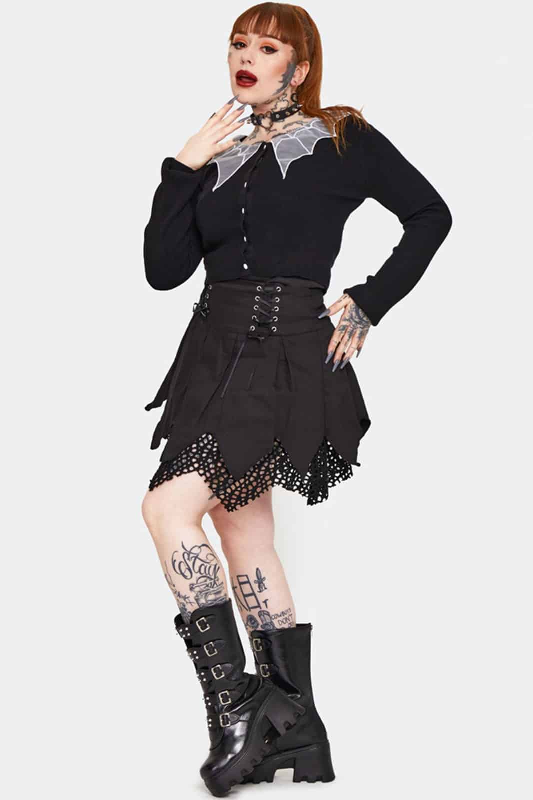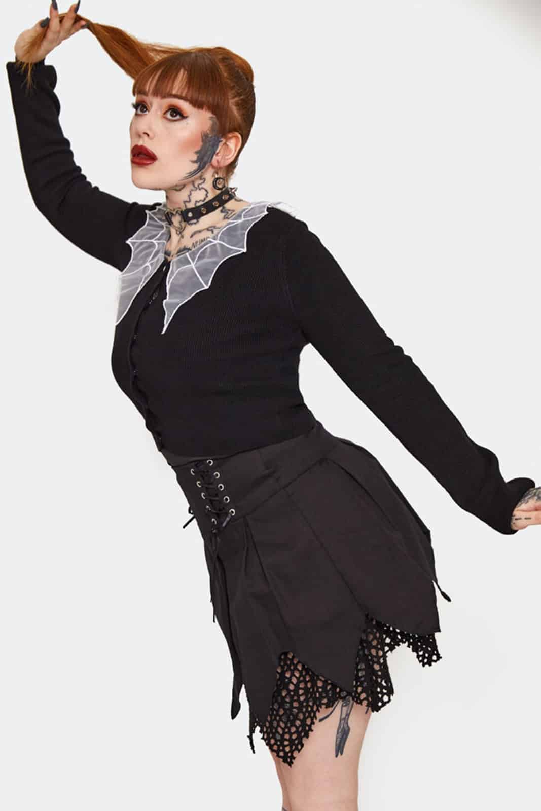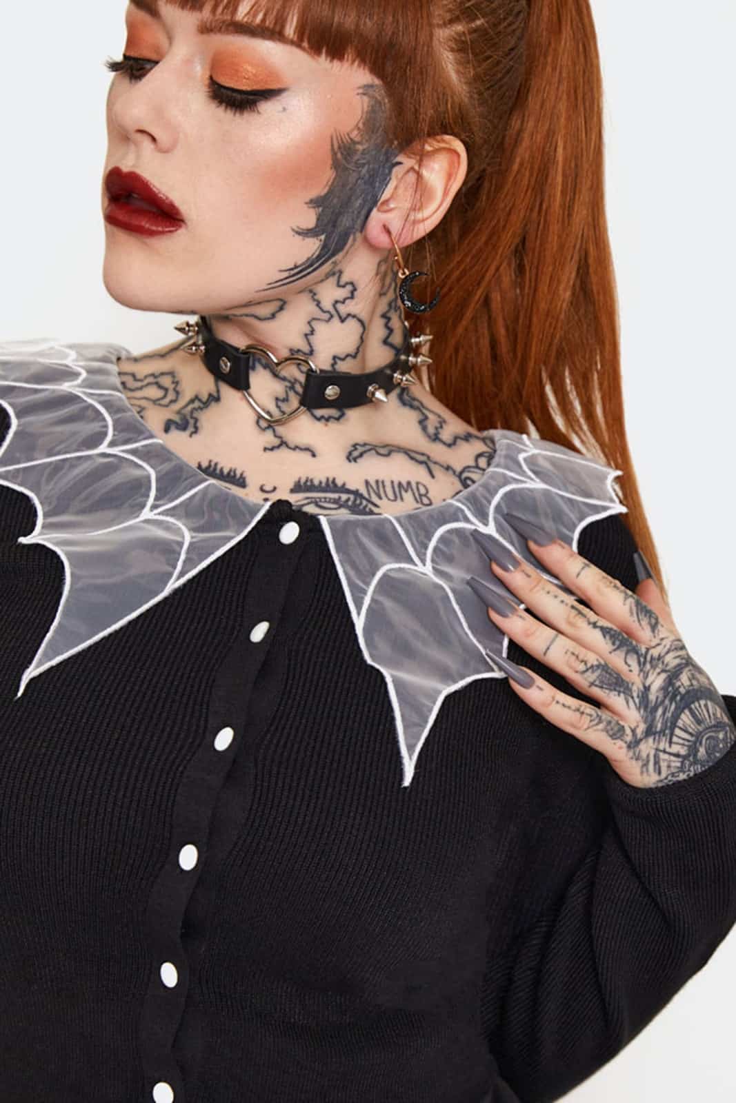 Diese geknöpfte Gothic Strickjacke besticht durch ihren auffälligen Spinnennetzkragen, der sofort ins Auge fällt und einen alternativen Look unterstreicht. In klassischem Schwarz gehalten, mit Rundhalsausschnitt, langen Ärmeln und einer Knopfleiste mit fünf weißen Knöpfen, vereint sie schlichte Eleganz mit einem Hauch von Dark Romance. Perfekt kombinierbar mit Röcken, Hosen oder Kleidern und ein Must-Have für alle Liebhaberinnen alternativer Mode.