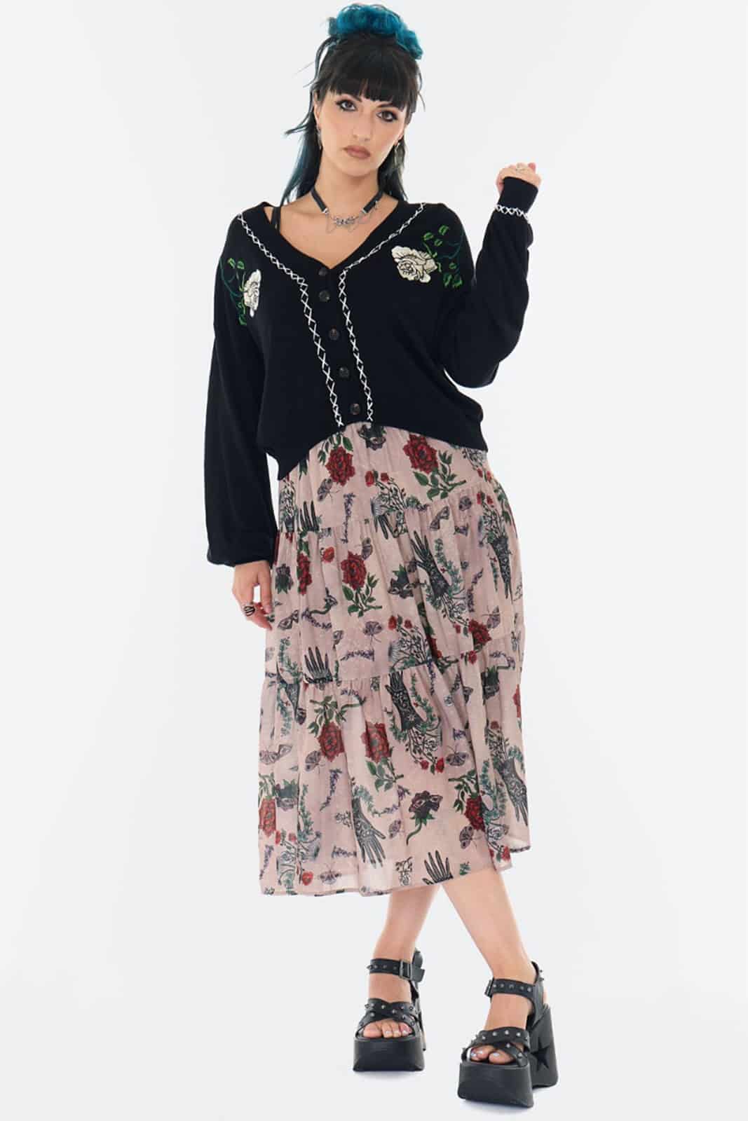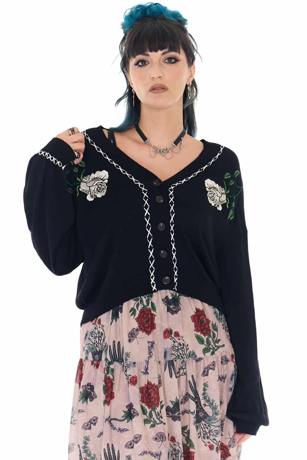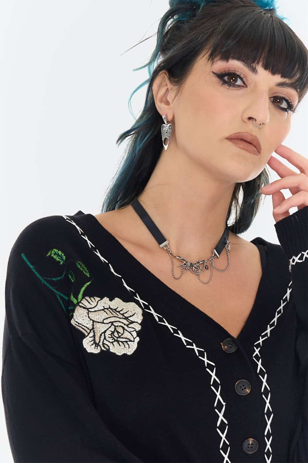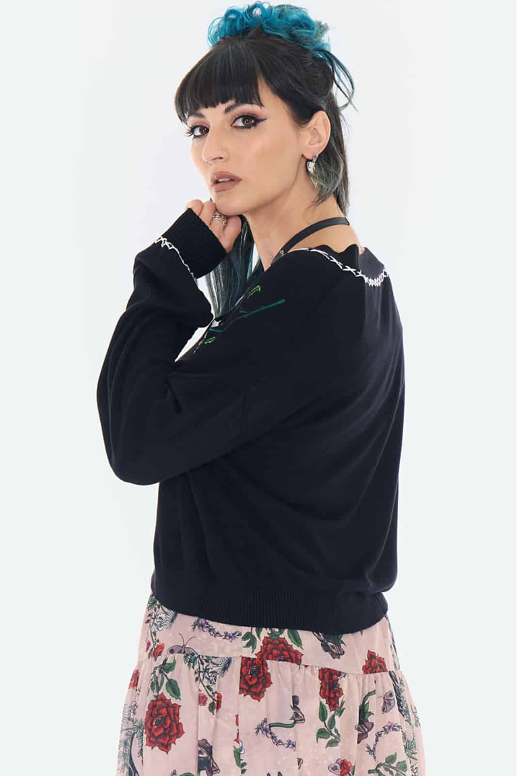 Sanfte Silhouette trifft auf dunkle Romantik – „Thornbound Bloom“ wirkt wie ein Relikt aus einem verwunschenen Garten. Die zarten Rosenstickereien und die kontrastreiche Ziernaht verleihen der Strickjacke eine geheimnisvolle, fast nostalgische Ausstrahlung.