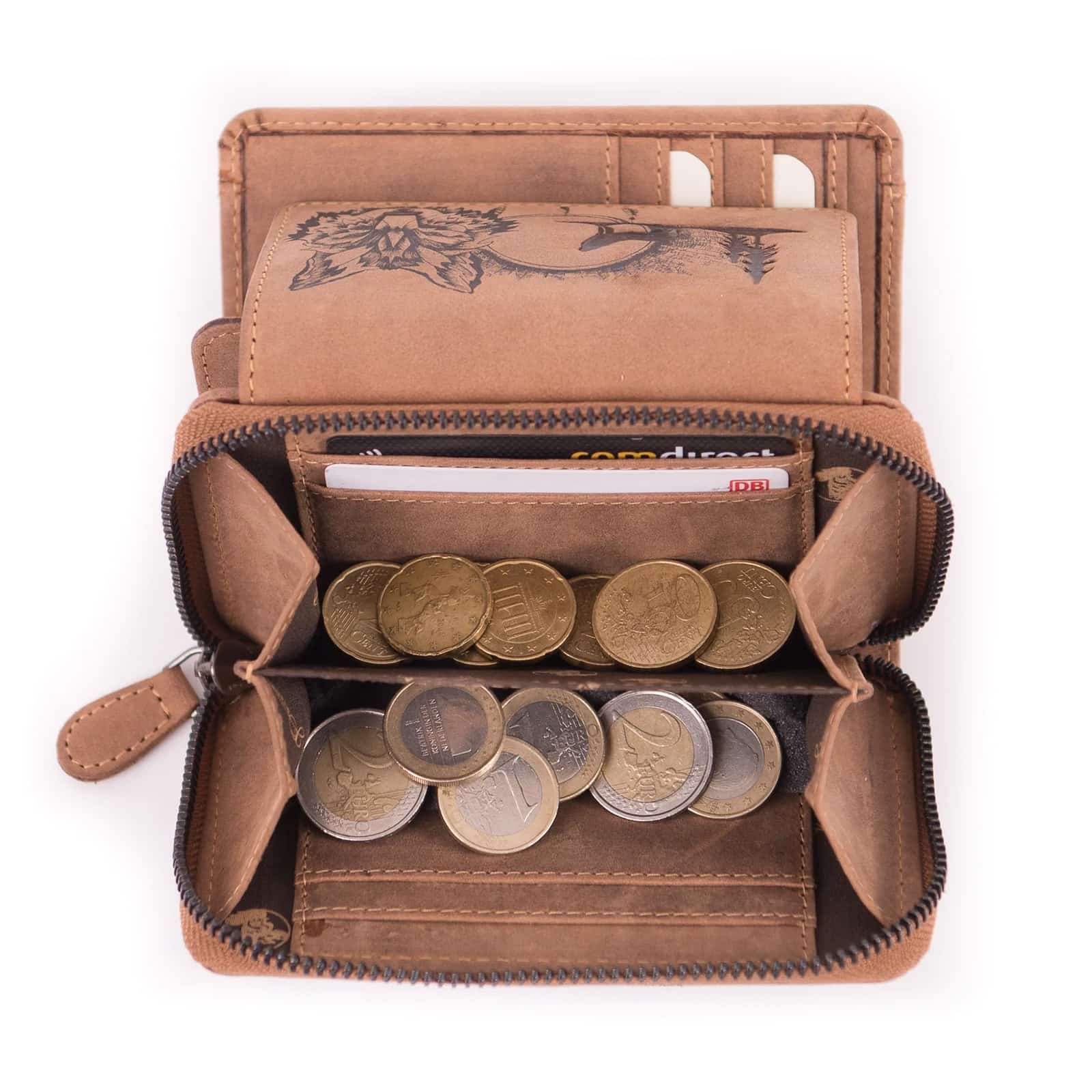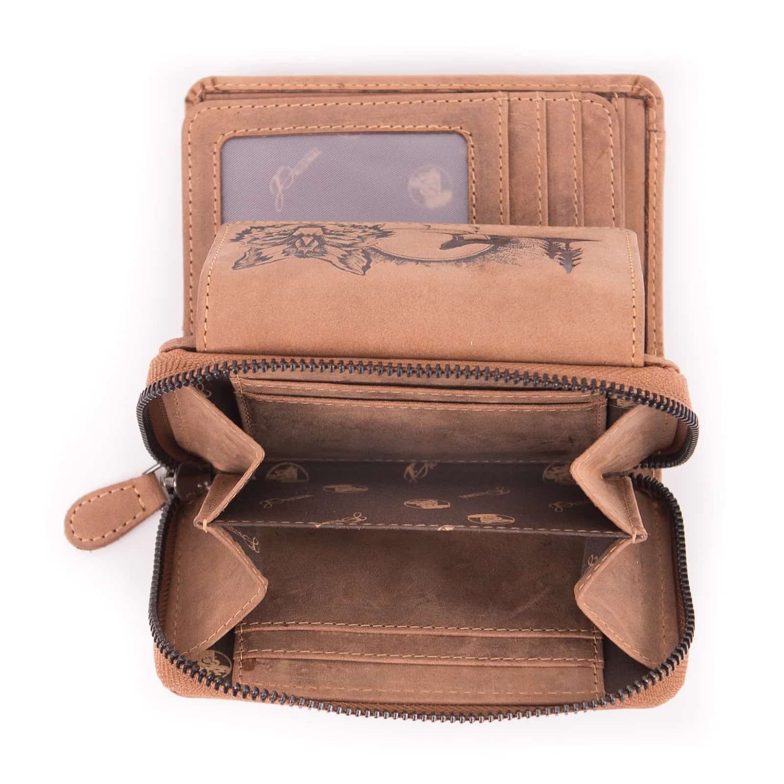 Kompakte Damengeldbörse mit Wolf-Motiv aus Büffelleder.