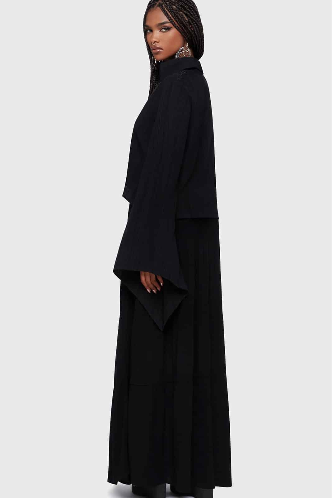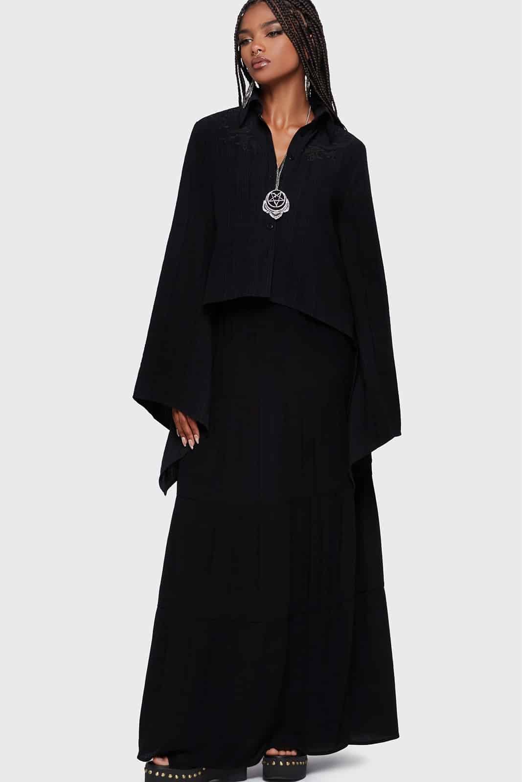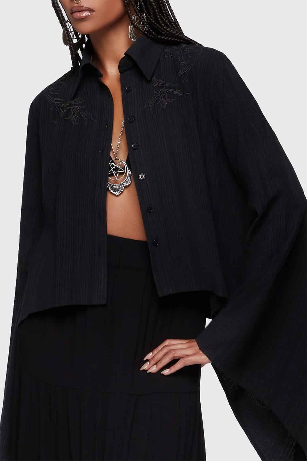 Diese außergewöhnliche Bluse verbindet fließende Leichtigkeit mit dunkler Eleganz. Der weich strukturierte Stoff und die feinen Stickereien an den Schultern verleihen dem Design eine mystische Ausstrahlung. Dramatische, asymmetrische Glockenärmel und der High-Low-Saum sorgen für eine besondere Silhouette, die sich perfekt für ausdrucksstarke Gothic-Looks und stilvolle Layering-Outfits eignet.