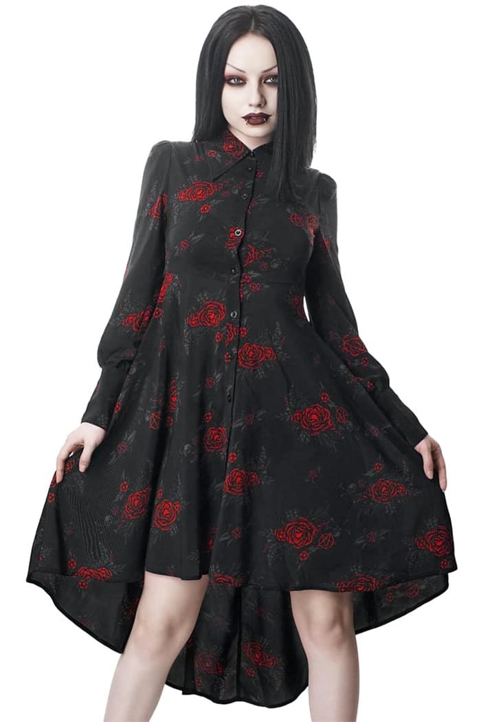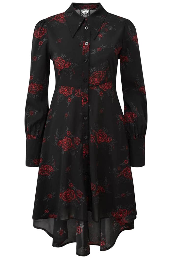 Elegantes Gothic Blusen-Kleid aus leichtem, chiffonartigem Material mit durchgehender Knopfleiste, spitzem Kragen und breiten Manschetten. Weich fließend, bedruckt mit Rosen, Schädeln und Pentagrammen, ausgestattet mit Puffärmeln und weit ausgestelltem Rockteil.