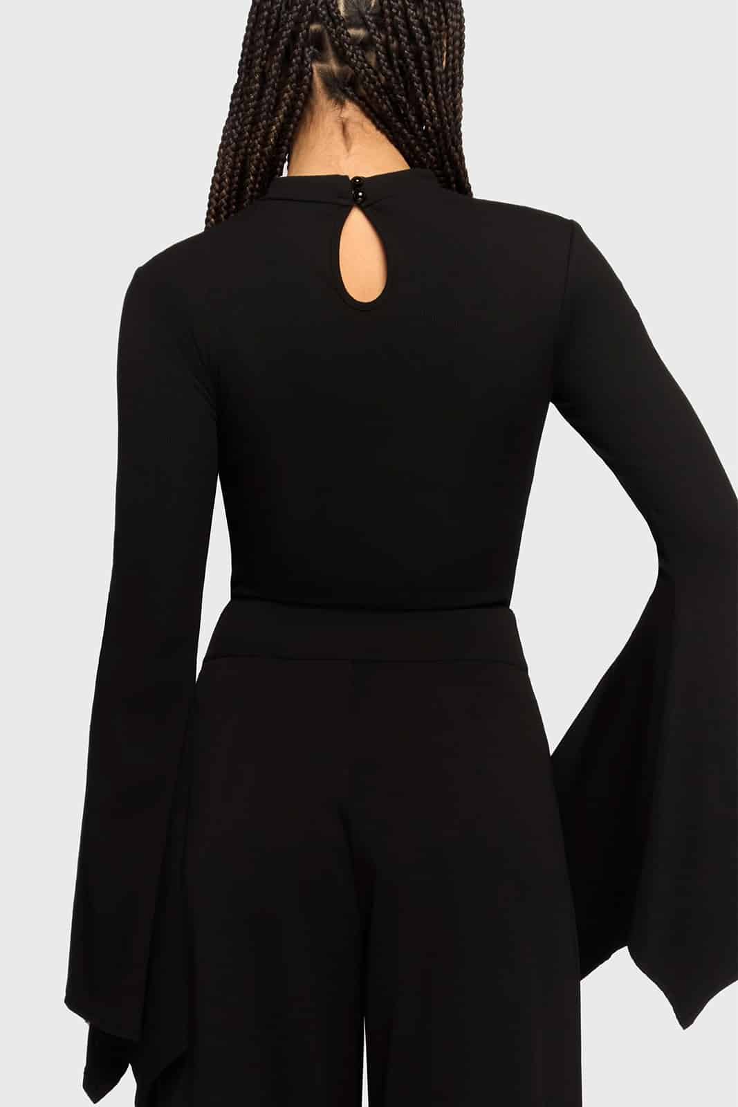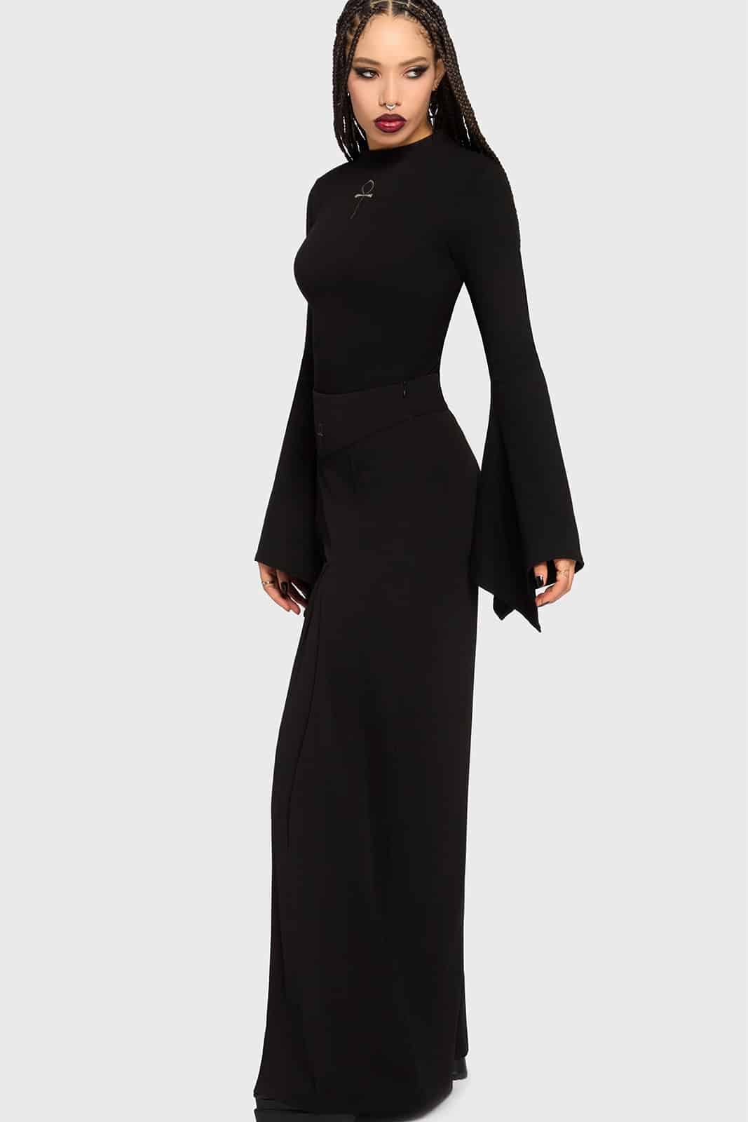 Klar, düster und mit ikonischem Detail – der Gloom Bell Body kombiniert eine schlichte Silhouette mit dramatischen Akzenten. Die ausgestellten Ärmel und die dezente Ankh-Stickerei verleihen dem Look eine elegante, okkulte Ausstrahlung.