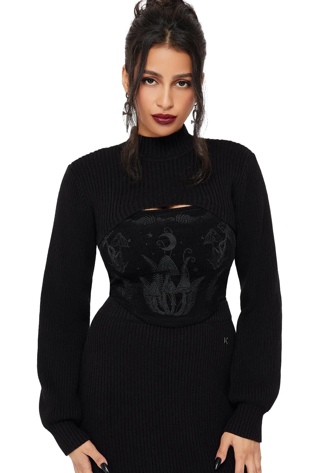 Dieses gestrickte Bolero-Oberteil vereint Struktur und Stil zu einem vielseitigen Statement-Piece. Der dichte, elastische Rippstrick sorgt für hohen Tragekomfort und eine figurbetonte Passform, während der hohe Kragen und die langen Ärmel mit Bündchen dem Look eine elegante Note verleihen. Ideal zum Kombinieren mit figurbetonten Kleidern oder High-Waist-Röcken – besonders harmonisch mit dem Belinda’s Woe Skirt.