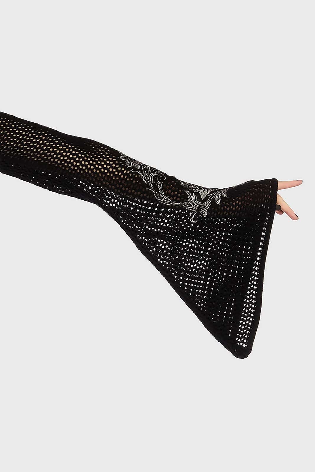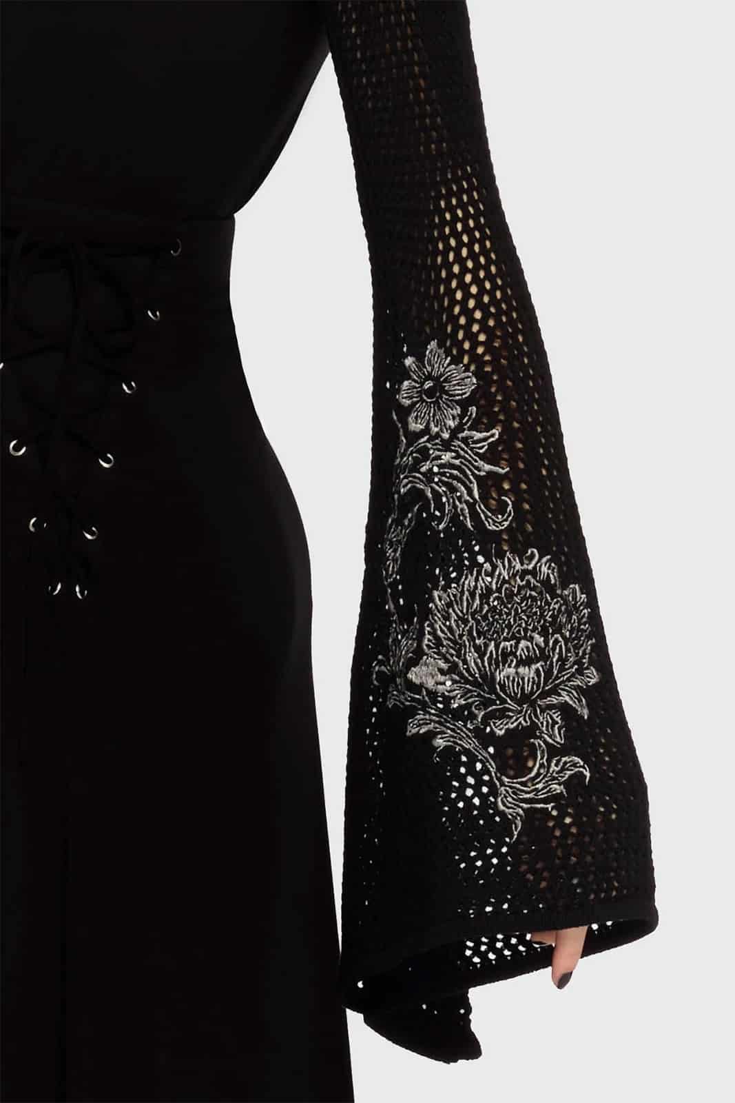 Leicht, fließend und voller dunkler Raffinesse: Der „Gaia Nightveil“ Bolero verleiht deinem Outfit eine elegante, fast mystische Tiefe. Das luftige Strickdesign trifft auf ausdrucksstarke Stickereien und weit ausgestellte Ärmel – perfekt als stilvoller Layer für jeden Gothic Look.