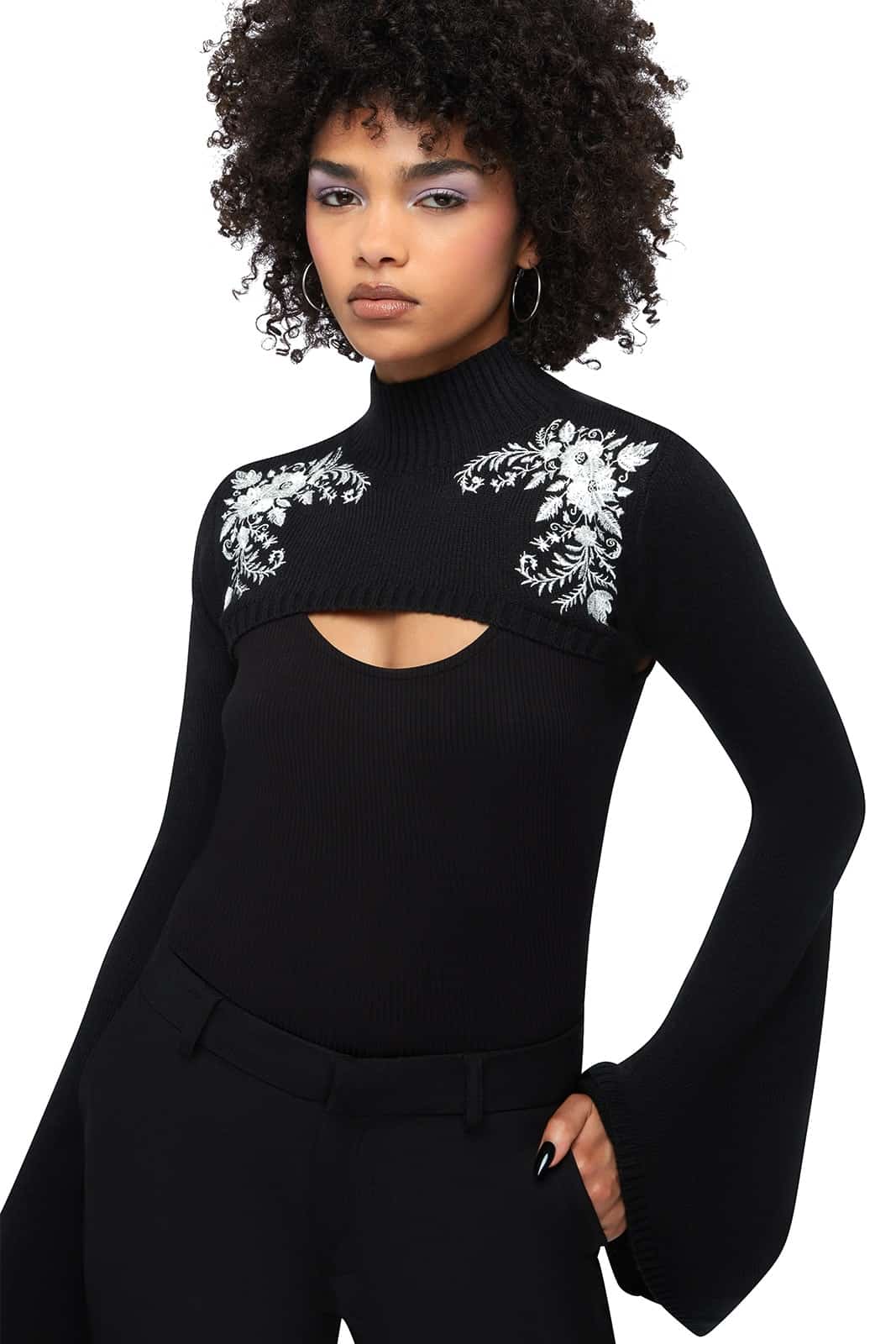 Dieses elegante Bolero-Top verbindet romantische Details mit moderner Silhouette und setzt stilvolle Akzente über Kleidern oder Tops. Der weiche, dehnbare Feinstrick sorgt für hohen Tragekomfort, während die schimmernde florale Stickerei dem Look eine edle, leicht düstere Note verleiht.
