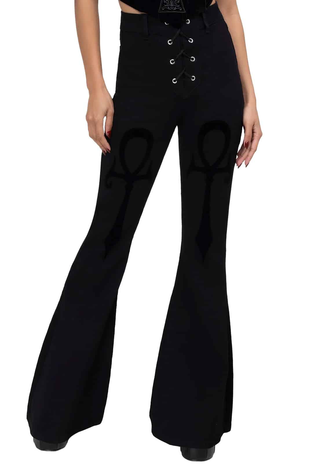 These gothic flared trousers conjure up the spirits of times gone by – made from soft, stretchy denim, they sit against the skin like dark magic. The dramatically flared legs flow like shadows through the night, while the velvet flocked ankh symbols on the thighs are reminiscent of ancient symbols of protection. With lacing, pockets and belt loops, it combines magic with everyday practicality. For all those who want to feel their power with every step – mystical, rebellious, stylish.