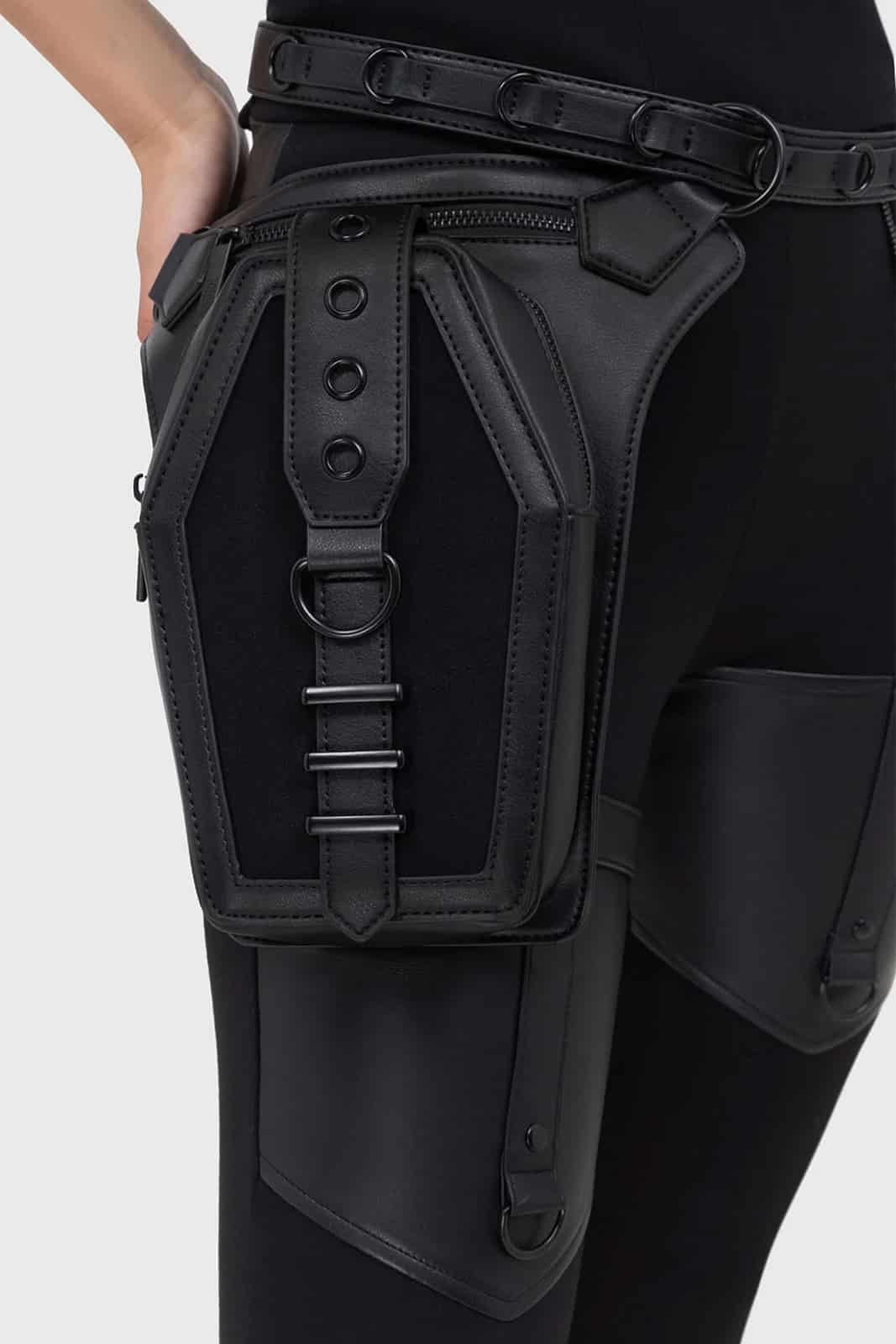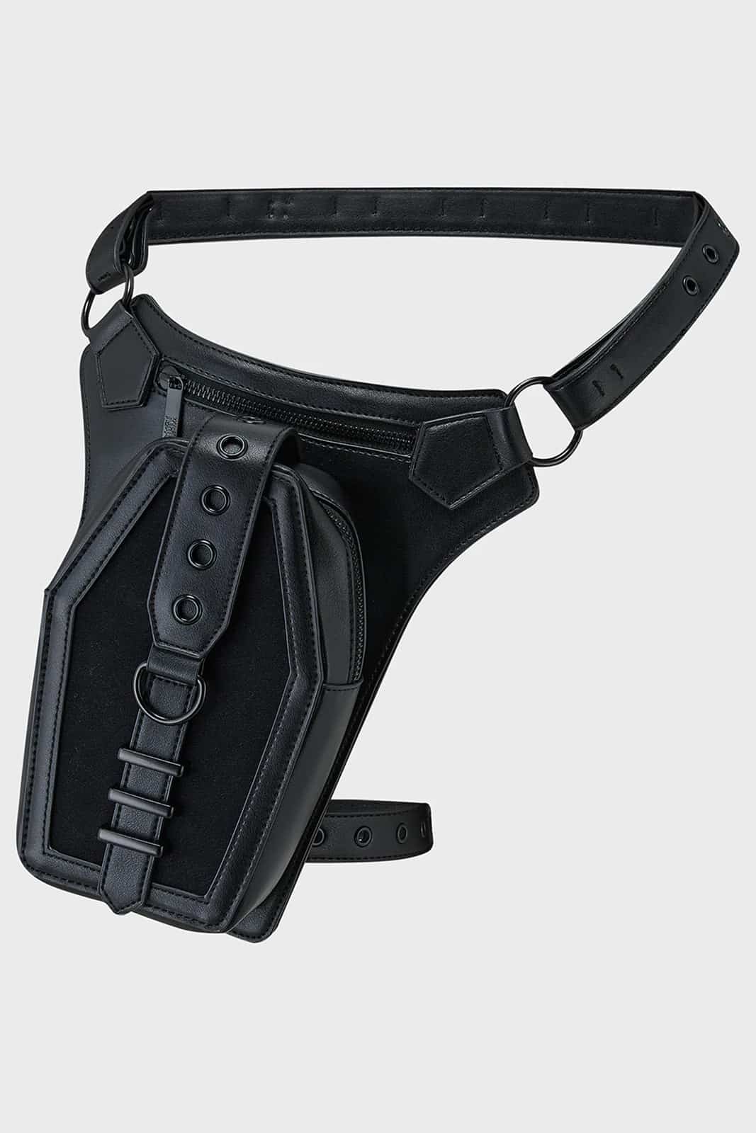 Eine markante Gürteltasche mit klarer, strukturierter Form und industrieller Attitüde. Das kantige Design wird durch auffällige Hardware-Details und verstellbare Taillen- und Beinriemen unterstrichen. Ob als Statement-Piece über Leggings, Kleid oder Shorts – dieses Modell setzt kompromisslose Akzente.