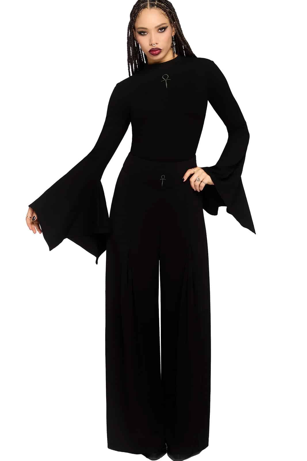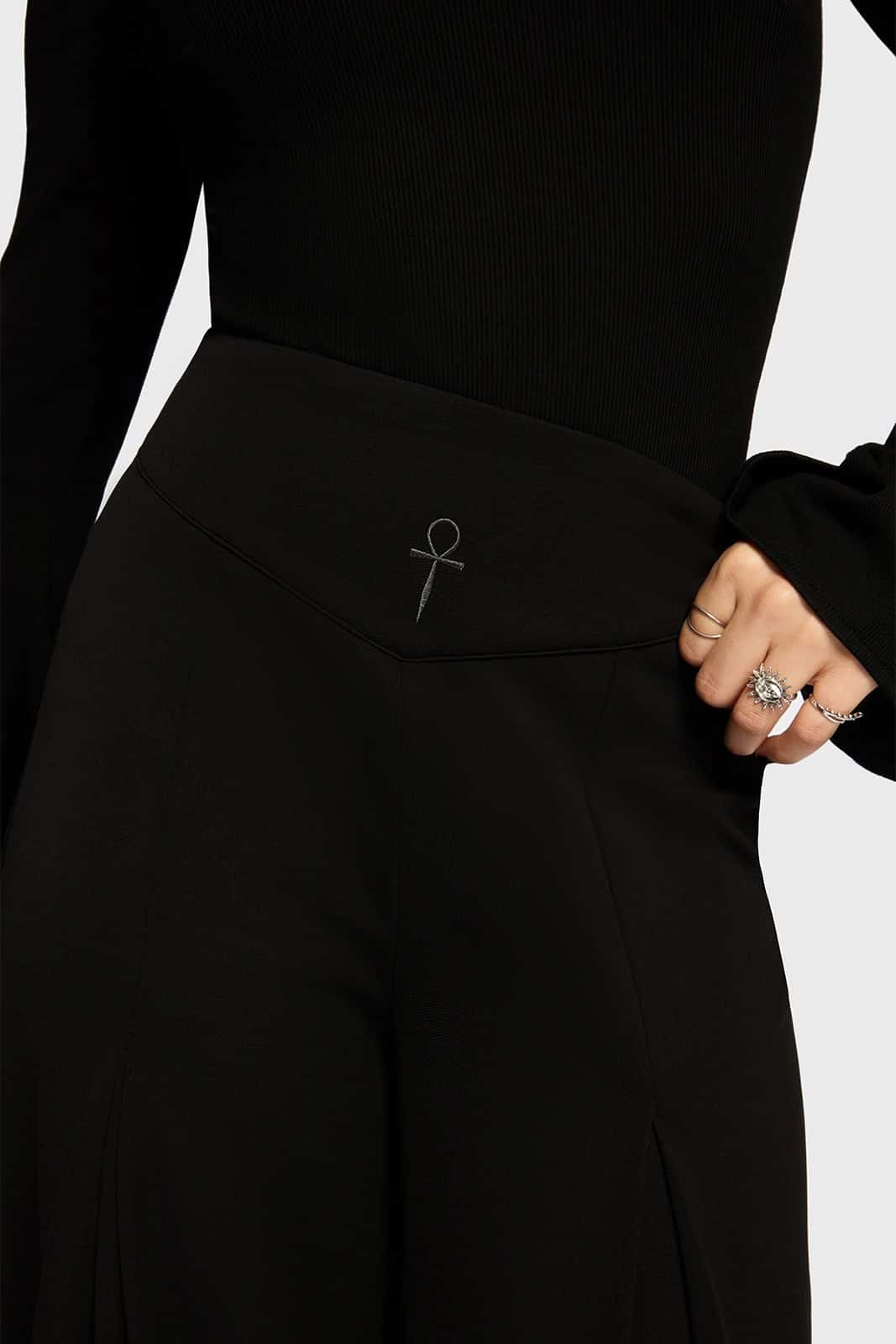Zeitlos, klar und mit subtiler Symbolik – die Shadow Spire Hose kombiniert eine elegante Silhouette mit minimalistischen Gothic-Details. Der hohe Bund und der fließende Fall der weiten Beine sorgen für eine starke, selbstbewusste Ausstrahlung.