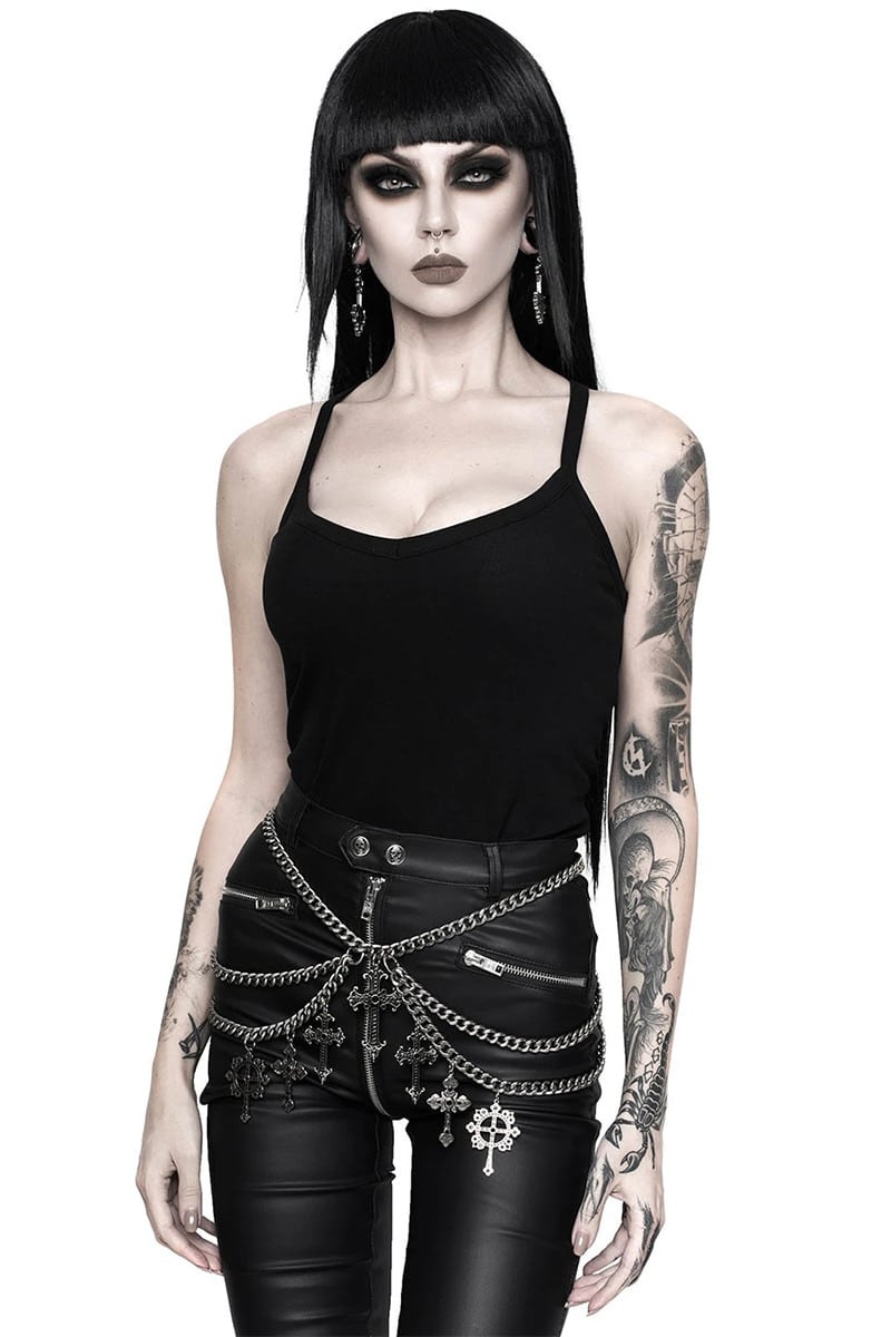 Hüftkette im Occult-Style aus drei schweren Ketten mit sieben Kreuzen in drei verschiedenen Ausführungen. Ausgestattet mit einem Karabinerhaken.