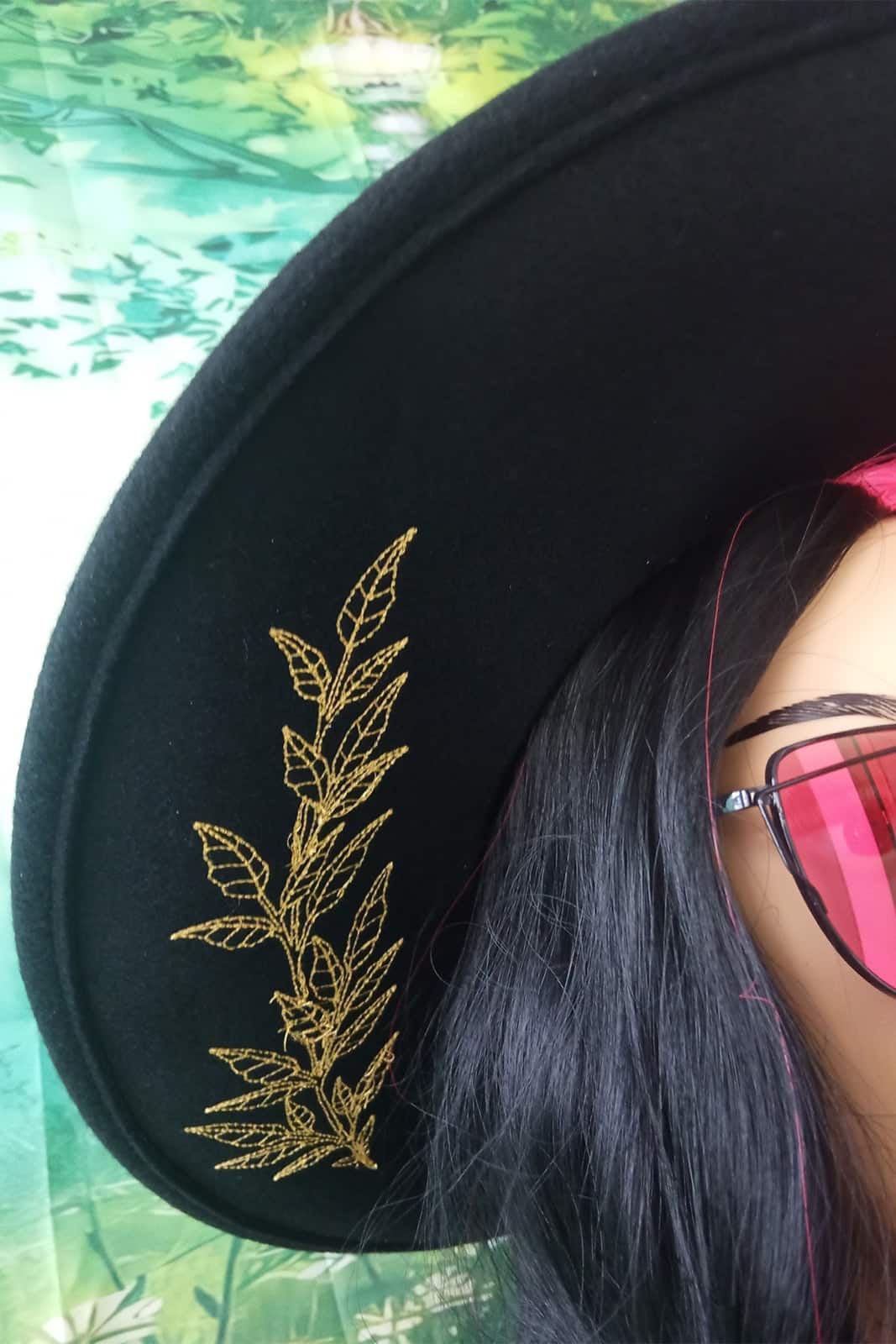 Edle goldfarbene Farn-Stickerei auf der Krempe