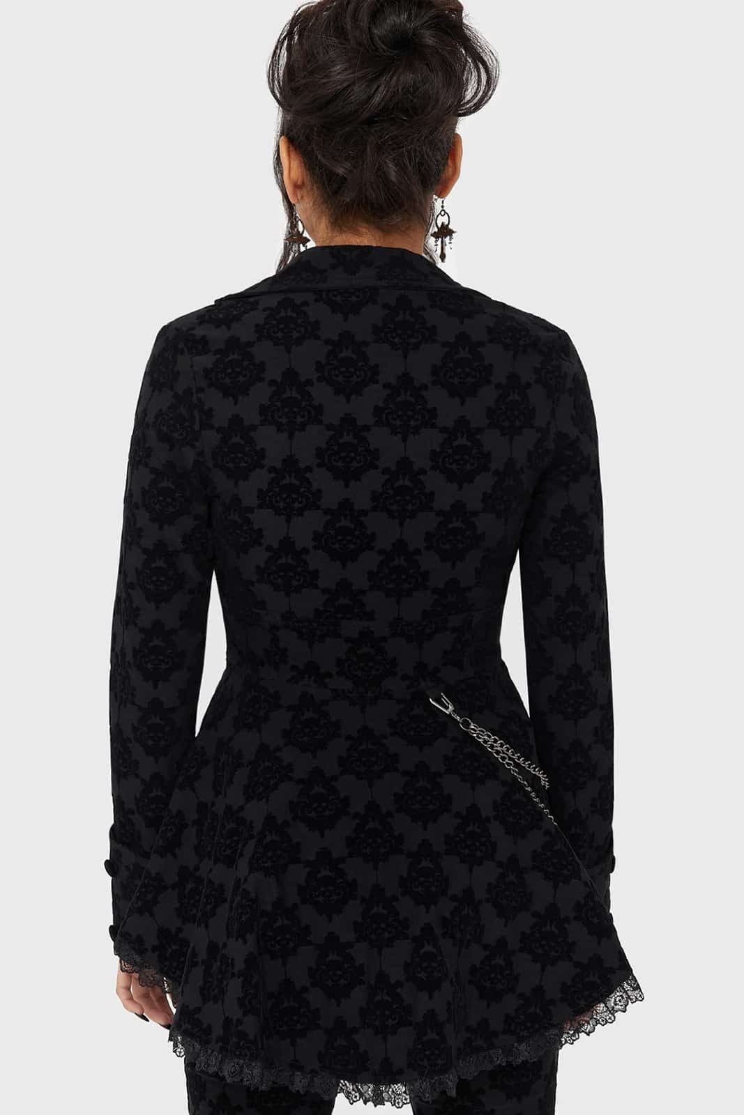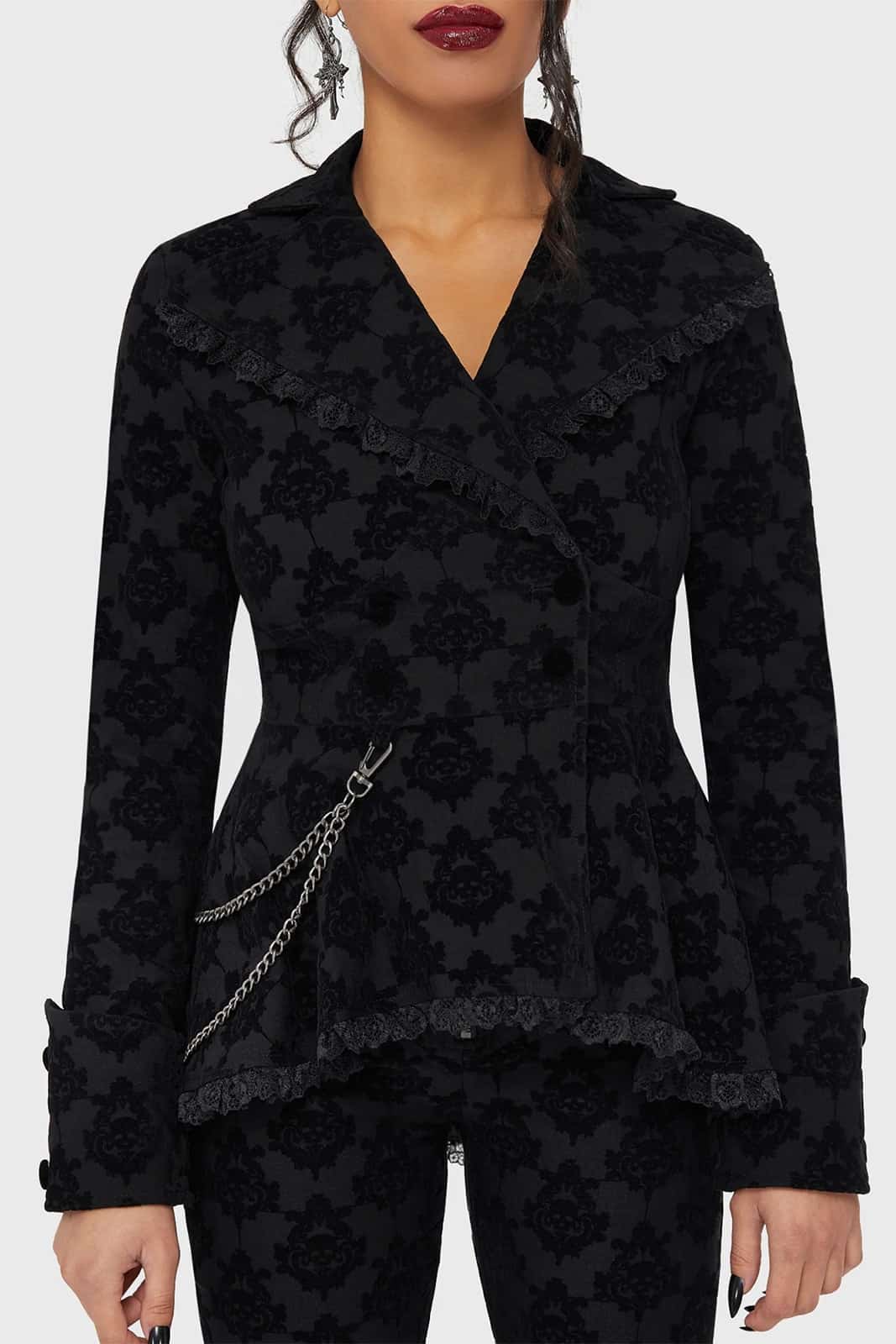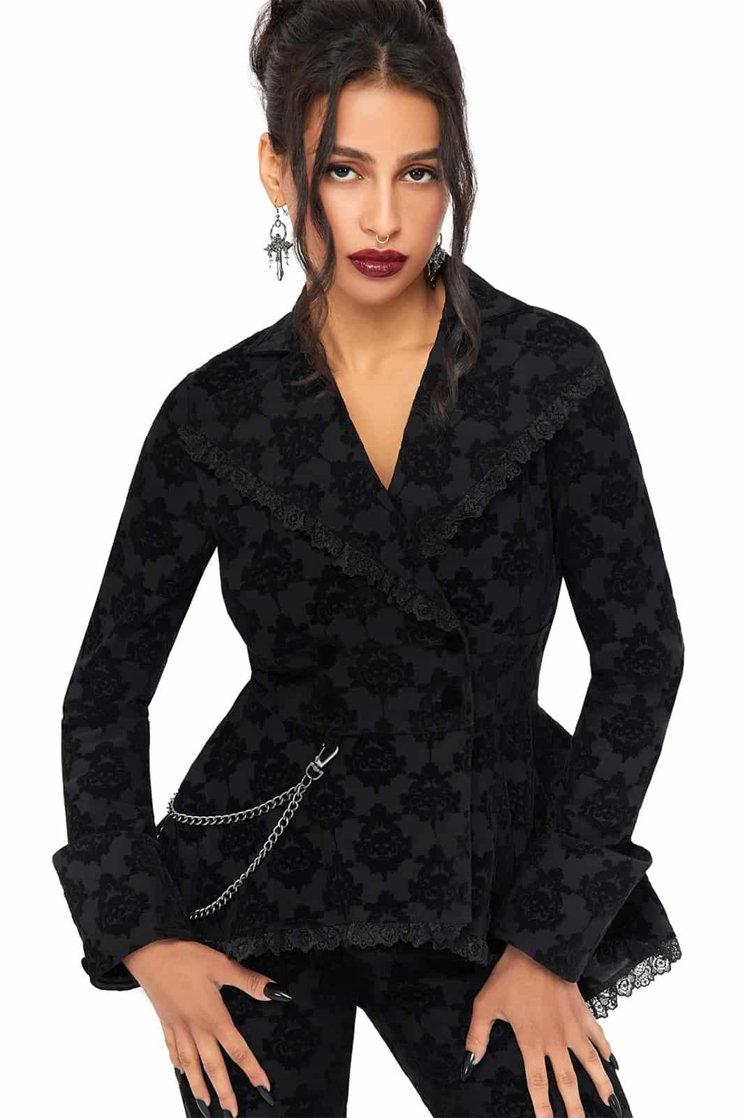 Ein eleganter, dunkel-romantischer Blazer mit samtigem Flocking-Muster und leicht ausgestelltem Peplum-Schnitt. Die abnehmbaren Ketten setzen einen dezenten Gothic-Akzent, während die Spitzenbesätze an Kragen und Saum den Look weich abrunden. Perfekt für elegante Nights-Out, viktorianische Vibes oder Dark Fashion Alltag.