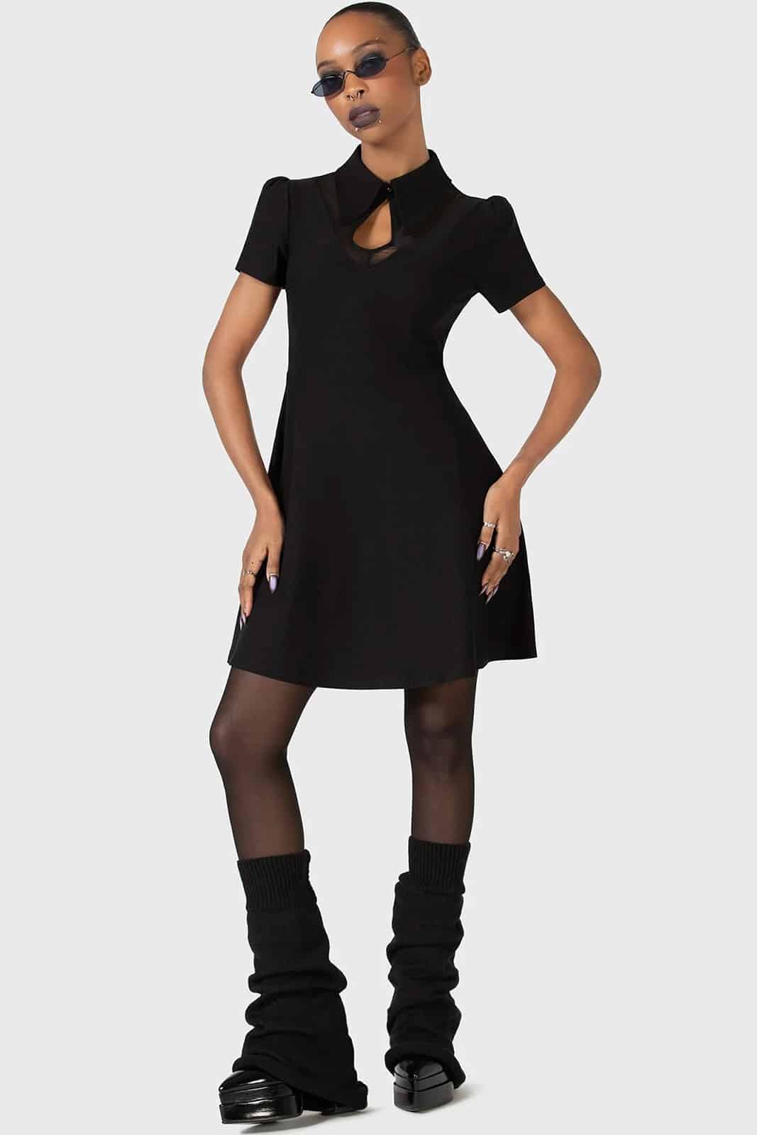 Kihilist Minikleid aus weichem und elastischem Material mit großem Kragen und Knopfverschluß. Ein reizvoller Mesh-Einsatz endet in kurzen süßen Puffärmeln. Ein Schlüssellochdetail verziert den Bereich oberhalb der Brust.