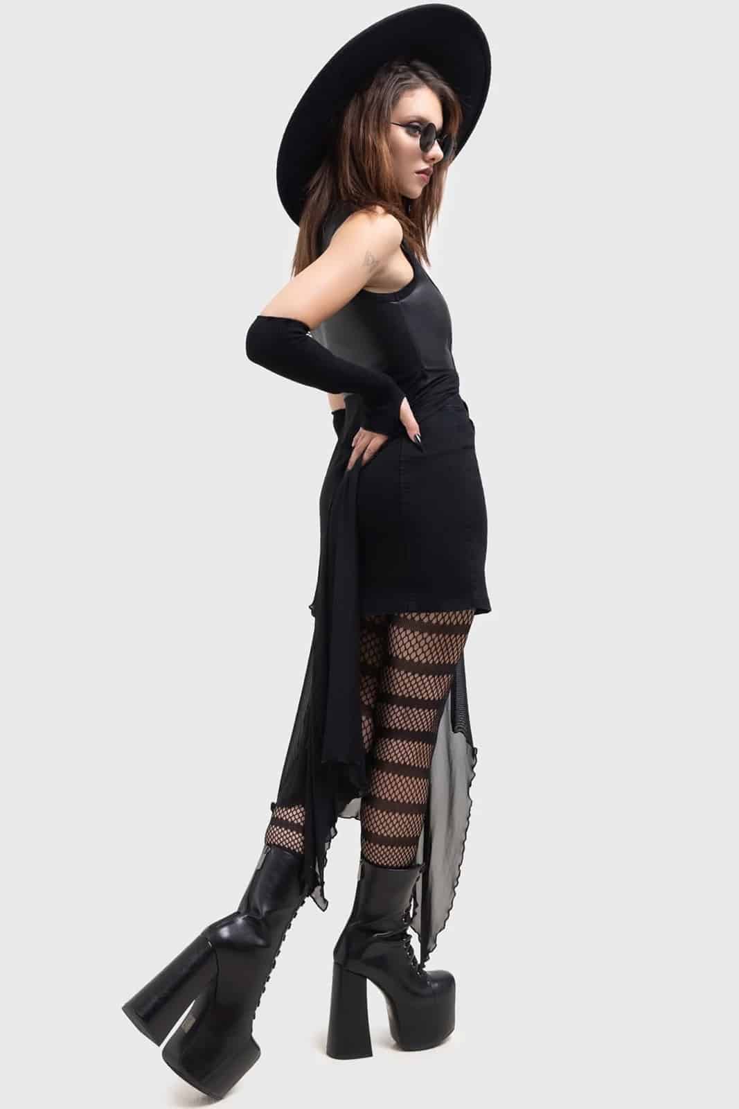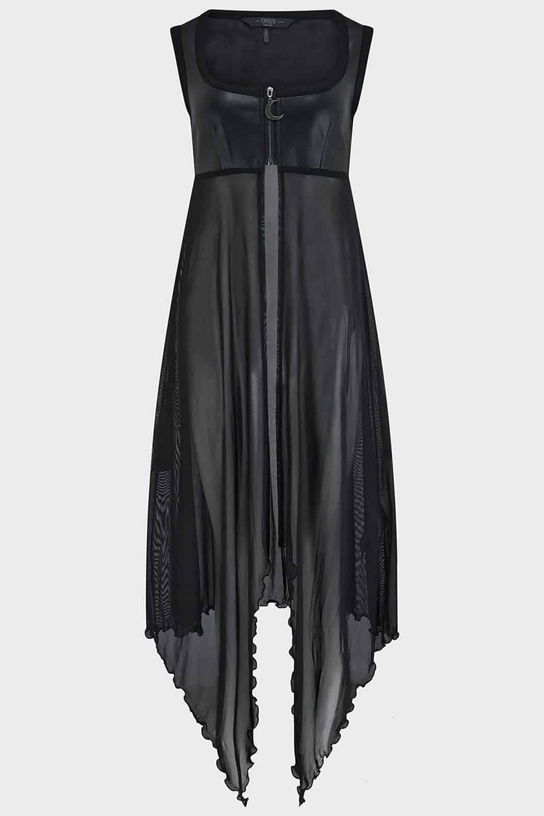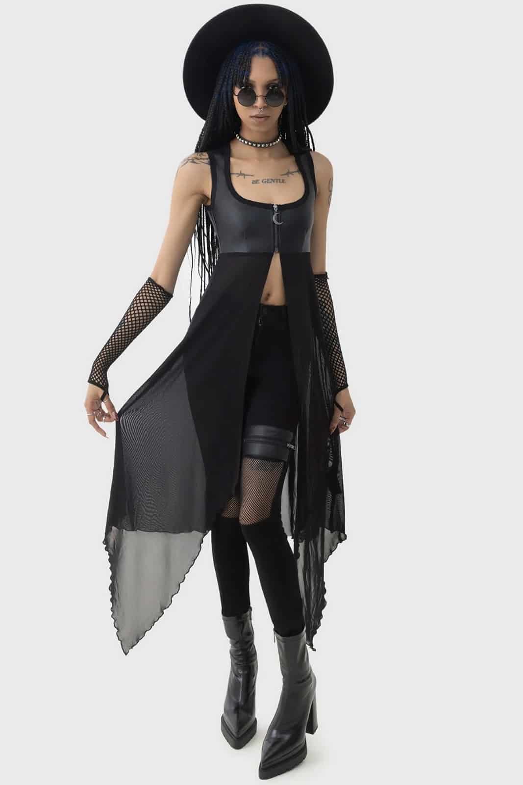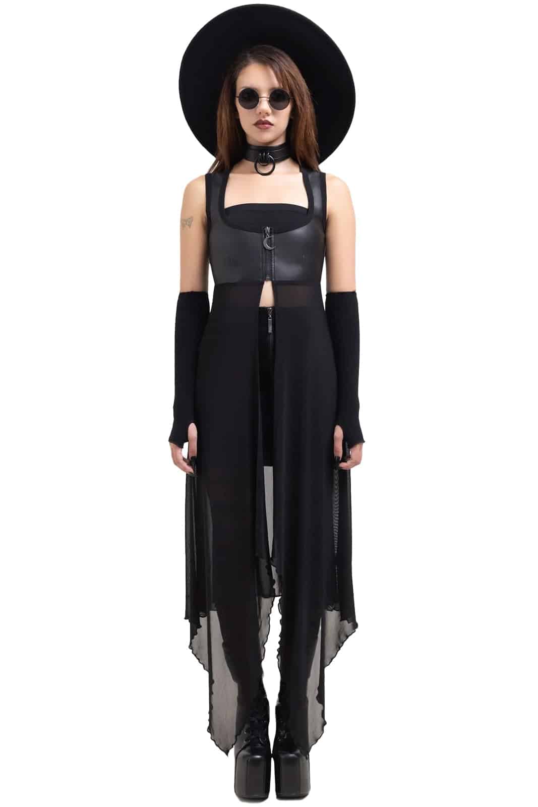 Sleeveless long top from the Kihilist range with wide straps at the shoulders. The top is made of soft faux leather at the top and changes to a slightly transparent polyester fabric at the waist. The front has a zipper and moon zipper.