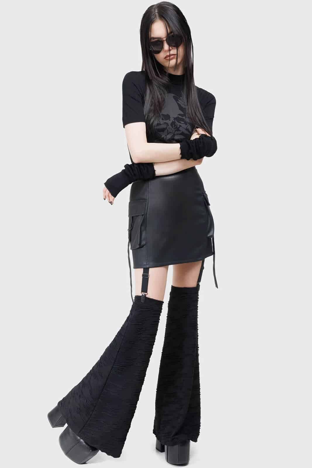 Kihilist Gothic-Rock aus hochwetigem Kunstleder mit aufgesetzten Taschen und integrierten Haltern für die abnehmbaren Beinwärmer aus einer weichen Polyetermischung im Distressed-Style.