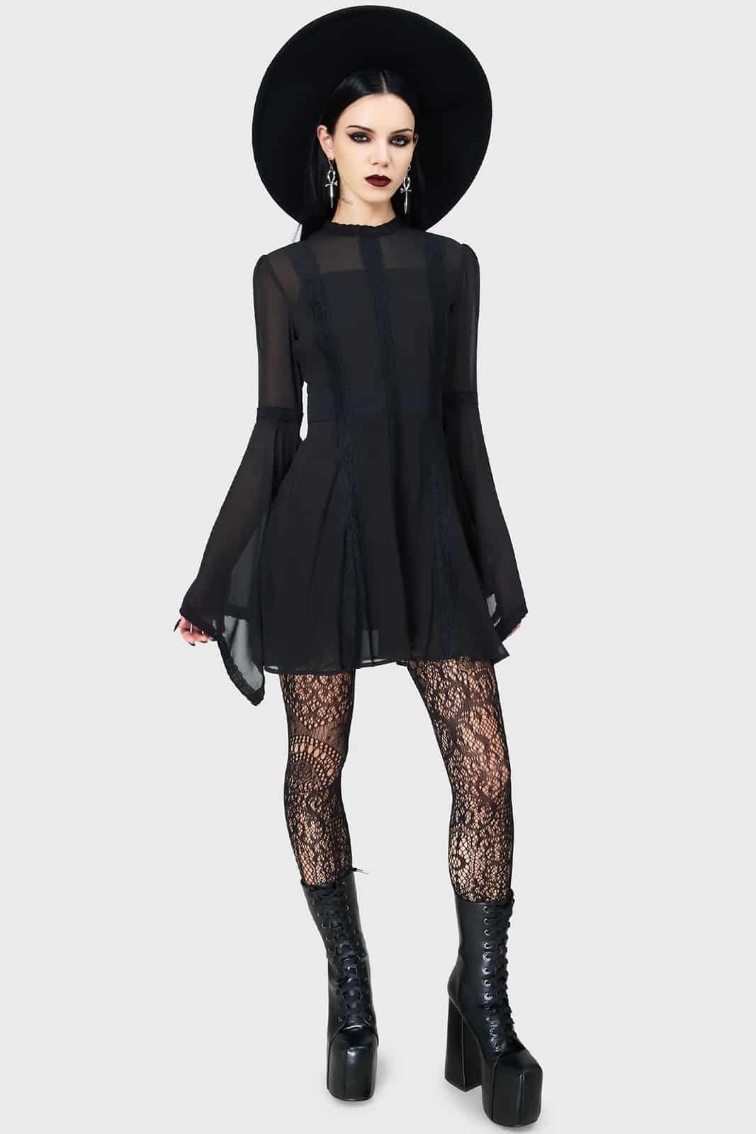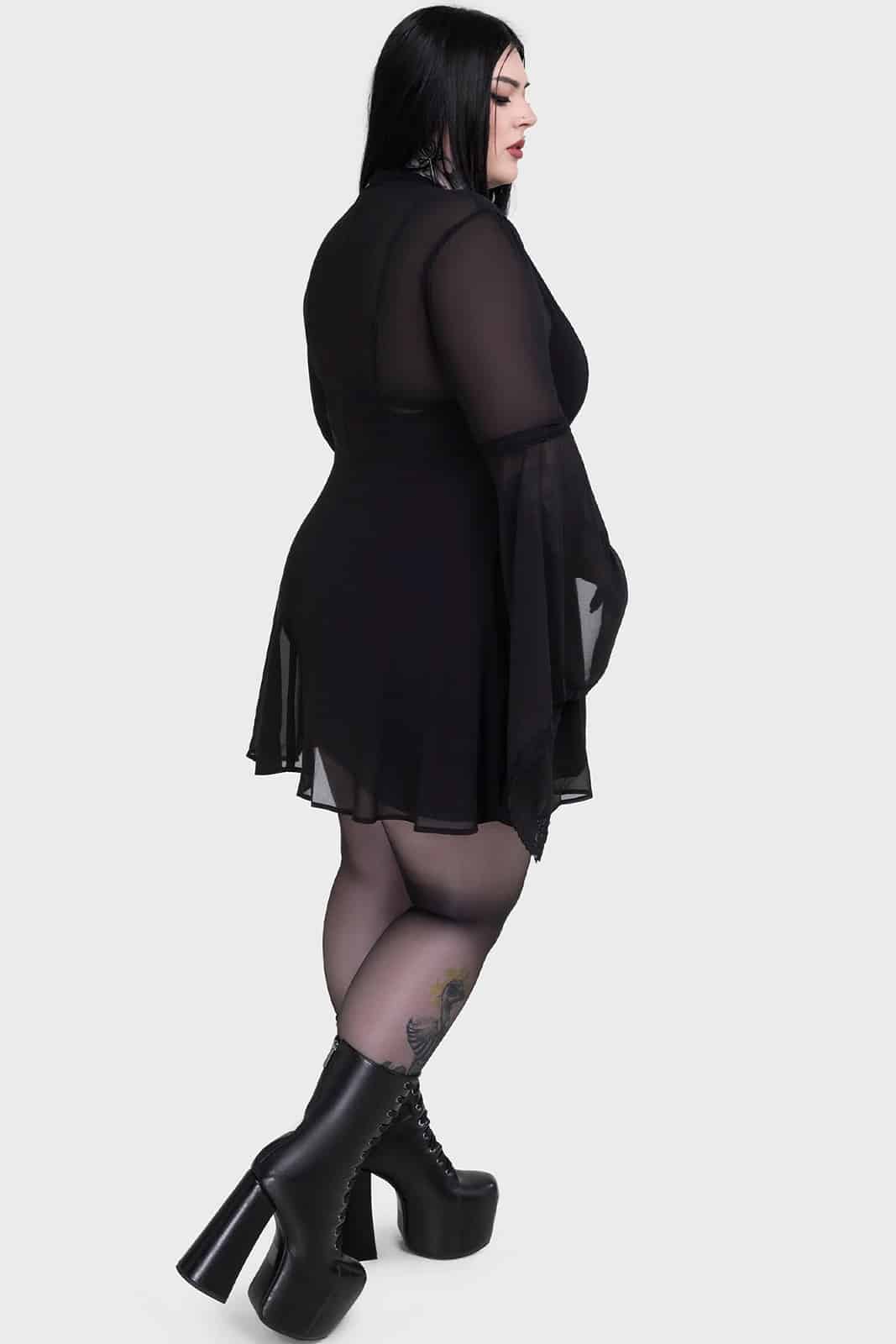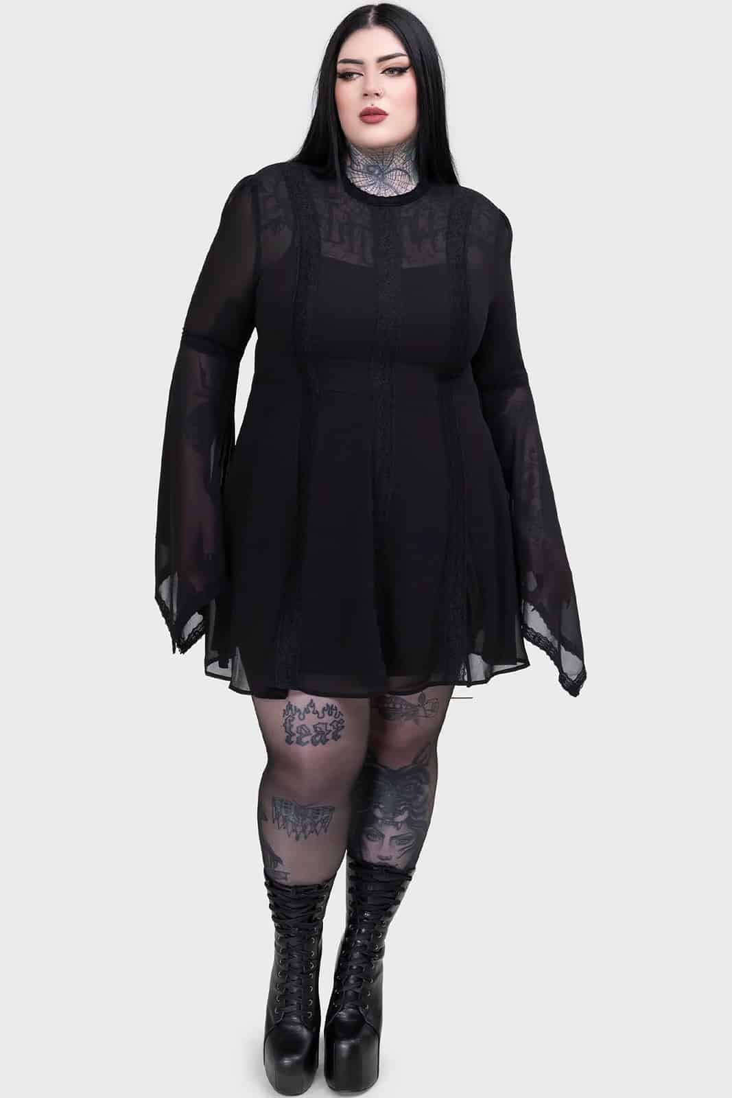 Ein Hauch von Dunkelromantik trifft auf fließende Eleganz – das BEGONE Kleid umspielt deine Silhouette mit zartem Chiffon und raffinierten Spitzendetails. Die leicht transparente Optik, kombiniert mit dem schwingenden Minirock und den weit ausgestellten Ärmeln, verleiht deinem Look eine geheimnisvolle, fast schon geisterhafte Anmutung. Perfekt für besondere Nächte, Events oder einfach, wenn du ein starkes Statement setzen willst.