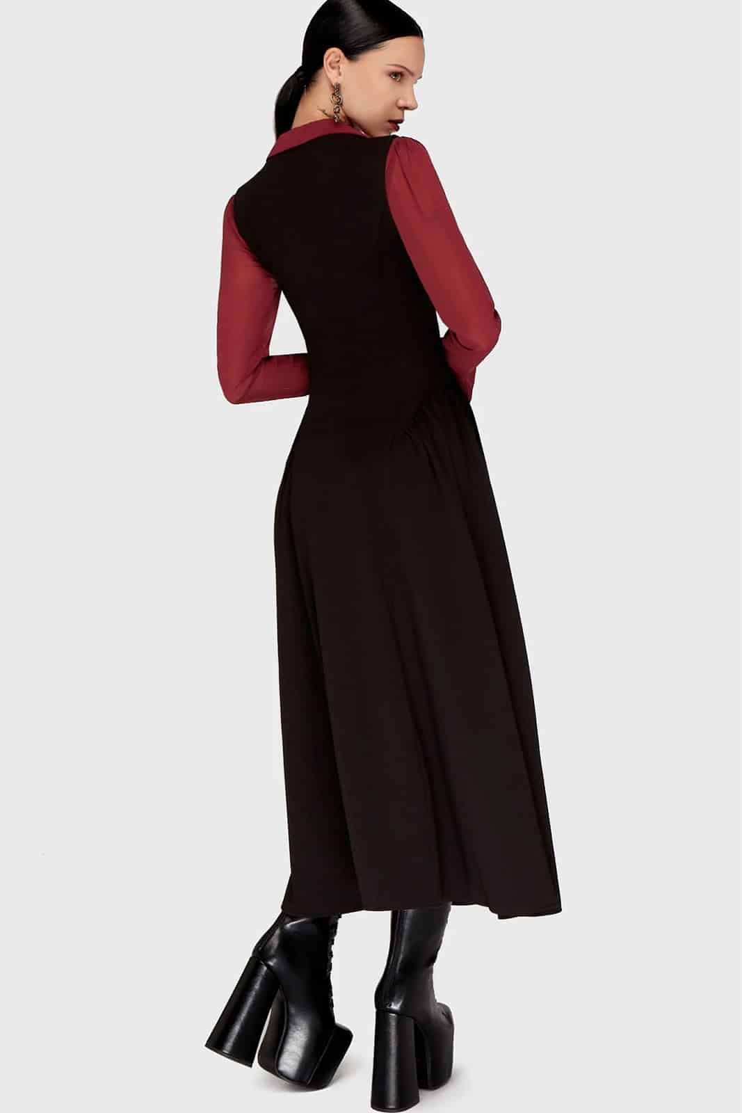 Dieses ärmellose Maxi-Kleid überzeugt mit klarer, dunkler Linienführung und einer markanten Underbust-Konstruktion, die die Silhouette elegant betont. Der fließende Stoff fällt weich bis zum Knöchel, während der durchgehende Front-Reißverschluss mit dekorativem Kreuz-Zipper einen starken, charakteristischen Akzent setzt. Ein vielseitiges Kleid für Gothic-, Alternative- oder minimalistisch dunkle Looks – kraftvoll, schlicht und ausdrucksstark zugleich.