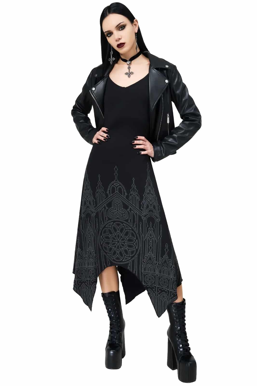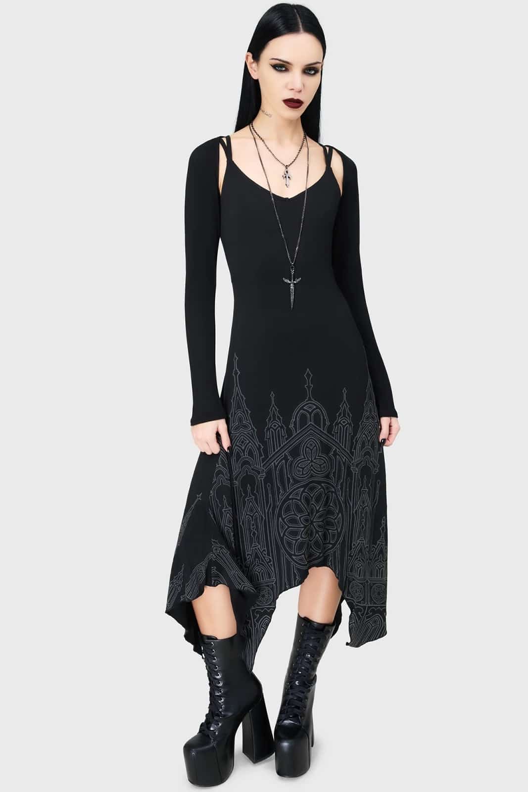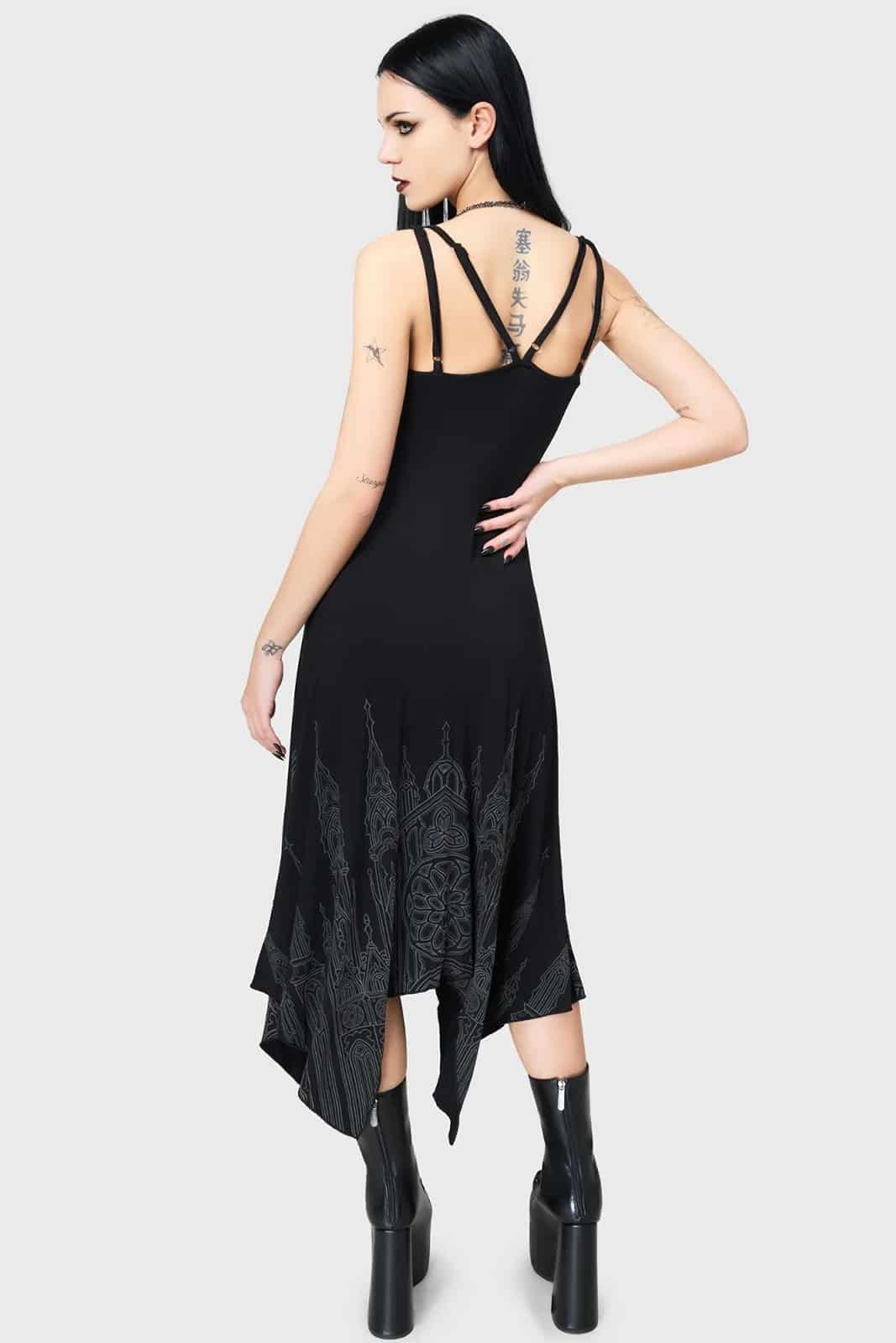 Ein fließendes Maxi-Kleid im düsteren Look – gefertigt aus weichem Stretchstoff und verziert mit einem eindrucksvollen Kathedralen-Print. Die verstellbaren Träger sorgen für optimalen Sitz, während der asymmetrische Hanky-Saum dem Kleid eine dramatische Silhouette verleiht. Figurbetont und perfekt für jede Gothic-Wardrobe.