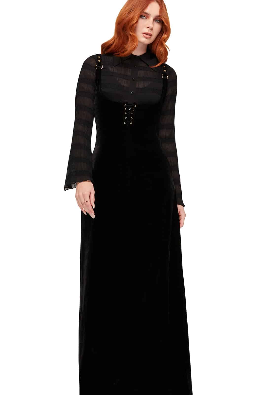Ein ausdrucksstarkes Underbust-Maxikleid, das sich perfekt mit Blusen, Tops oder Bodys kombinieren lässt. Der softe, tiefschwarze Stretch-Samt sorgt für eine elegante, körpernahe Silhouette, während Schnürdetails und goldfarbene Hardware dem Design eine edle, düster-romantische Note verleihen. Ein vielseitiges Statement-Piece für Gothic- und Alternative-Looks mit individueller Stylingfreiheit.