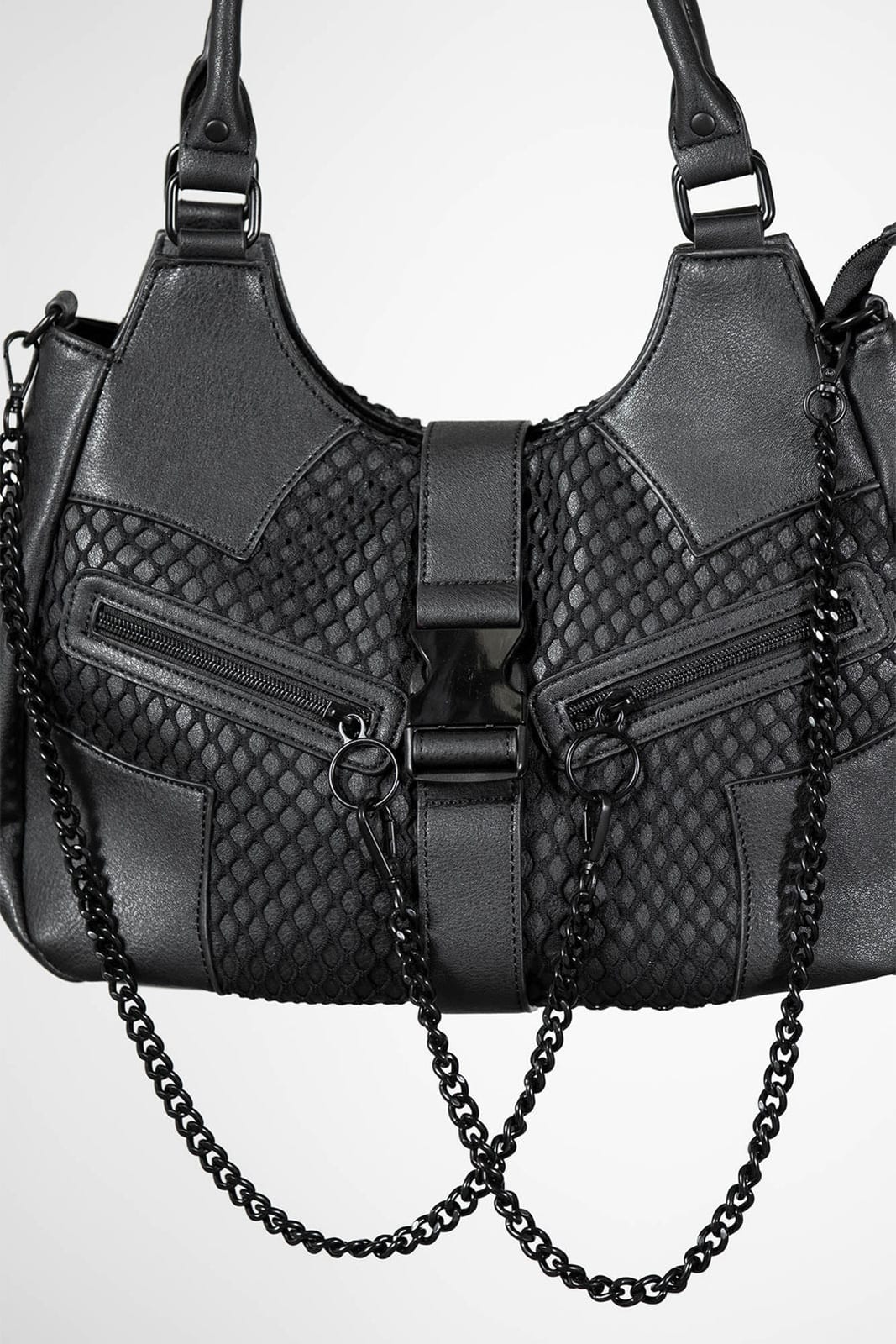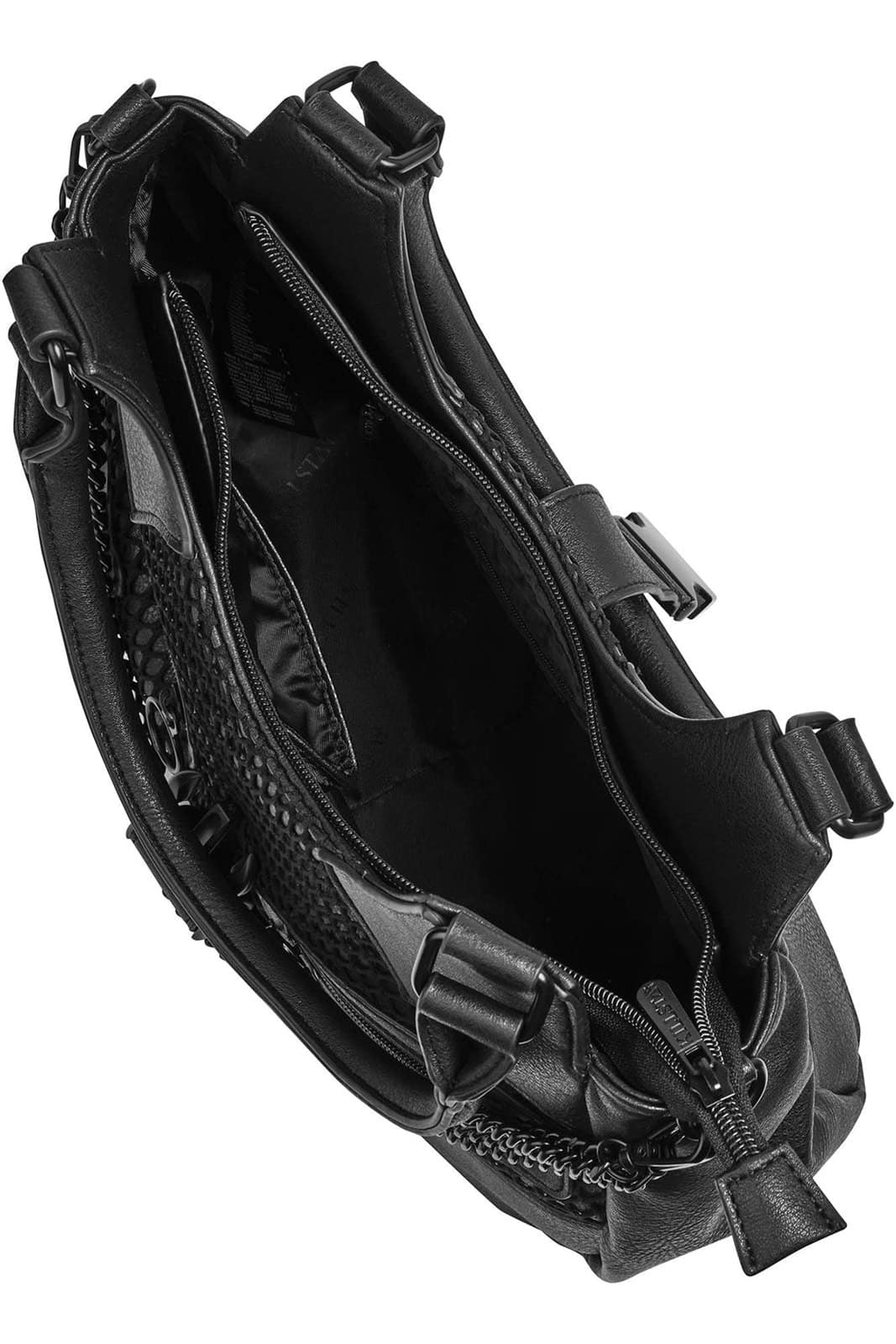 Statement handbag made of durable faux leather with flap and zipper closure underneath. So your belongings are well protected. Decorated with a detachable black chain and black metal details. Equipped with several inside pockets, one of them with zipper.