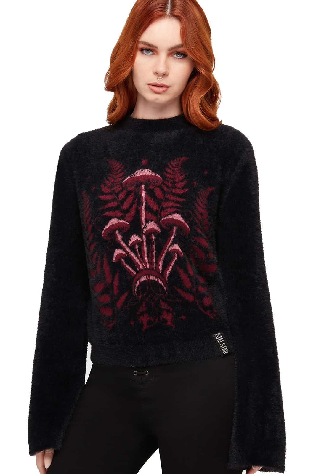 Der Gravebloom Sweater verbindet kuschelige Wärme mit düster-romantischer Ästhetik. Das tiefschwarze, besonders flauschige Strickmaterial sorgt für ein angenehmes Tragegefühl, während das aufwendig eingearbeitete Farn- und Fliegenpilzmotiv eine mystische, naturinspirierte Note setzt. Locker geschnittene Ärmel unterstreichen den entspannten Look und machen den Pullover zu einem ausdrucksstarken Statement für kalte Tage.
