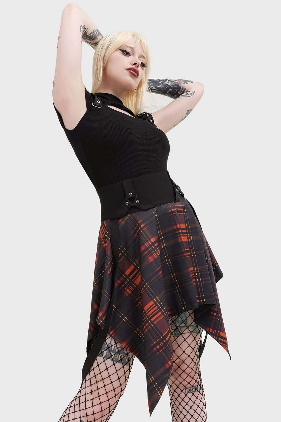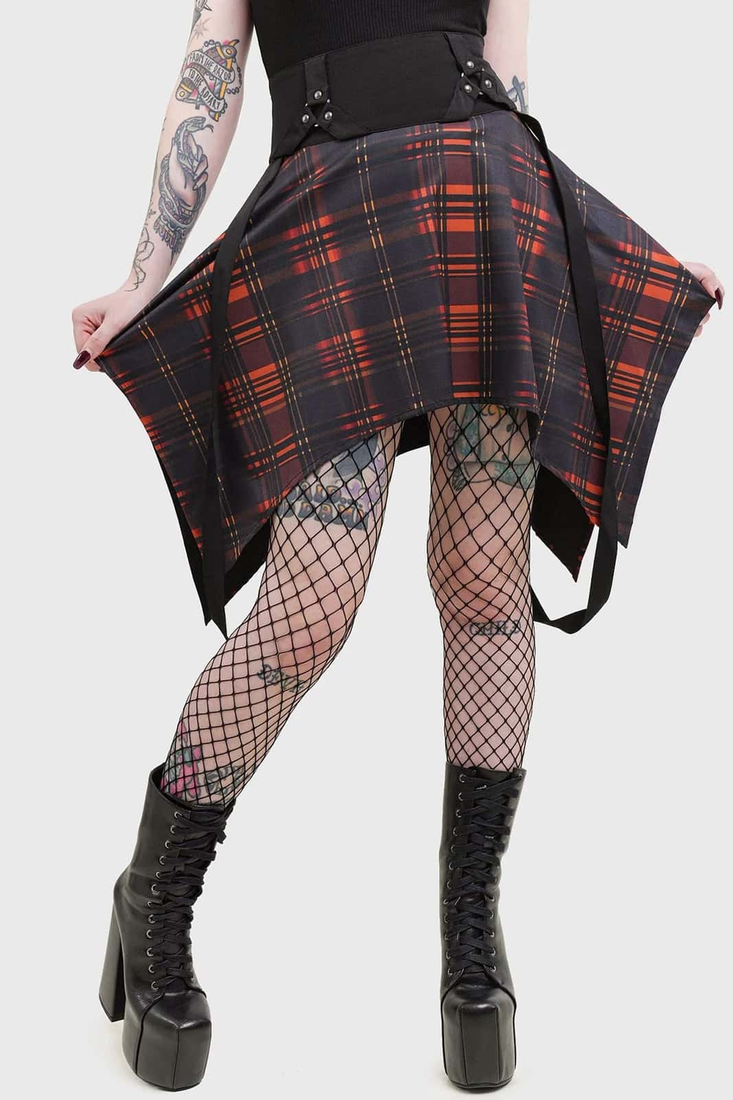 Knee-length skirt made of smooth, stretchy material with a statement tartan pattern in orange. The hem is cut in a non-plain, pointed hem. With zipper on the side. Fitted with side straps.