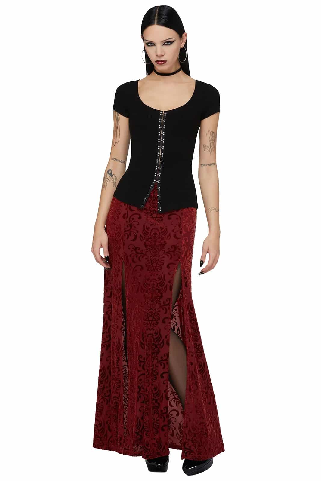 Dieser Maxirock ist pure Gothic-Drama. Der transparente, hoch elastische Stoff mit tiefrotem Samt-Burnout-Print sorgt für einen sinnlichen Look mit Bewegung, während das integrierte Minirock-Futter sicheren Tragekomfort bietet. High Waist geschnitten und mit zwei hohen Beinschlitzen versehen, vereint er Eleganz und Provokation – ideal für starke Auftritte bei Nacht.