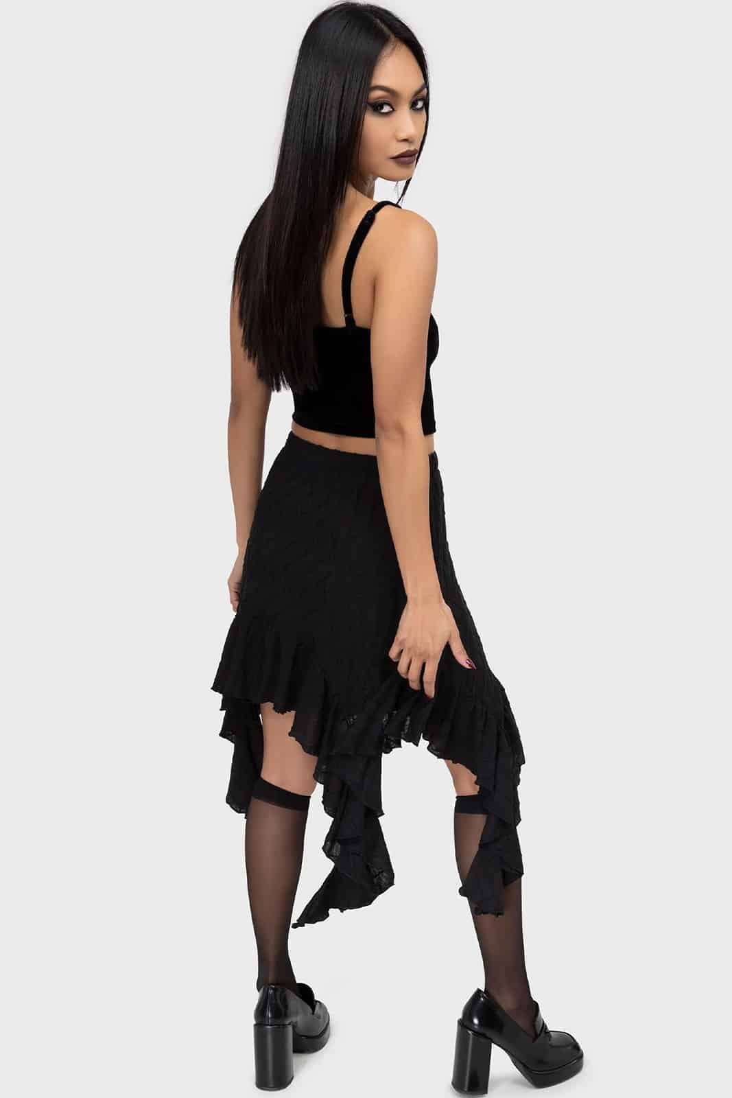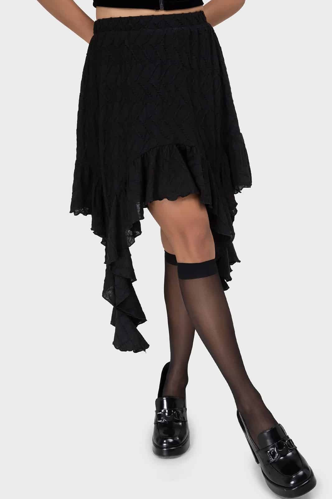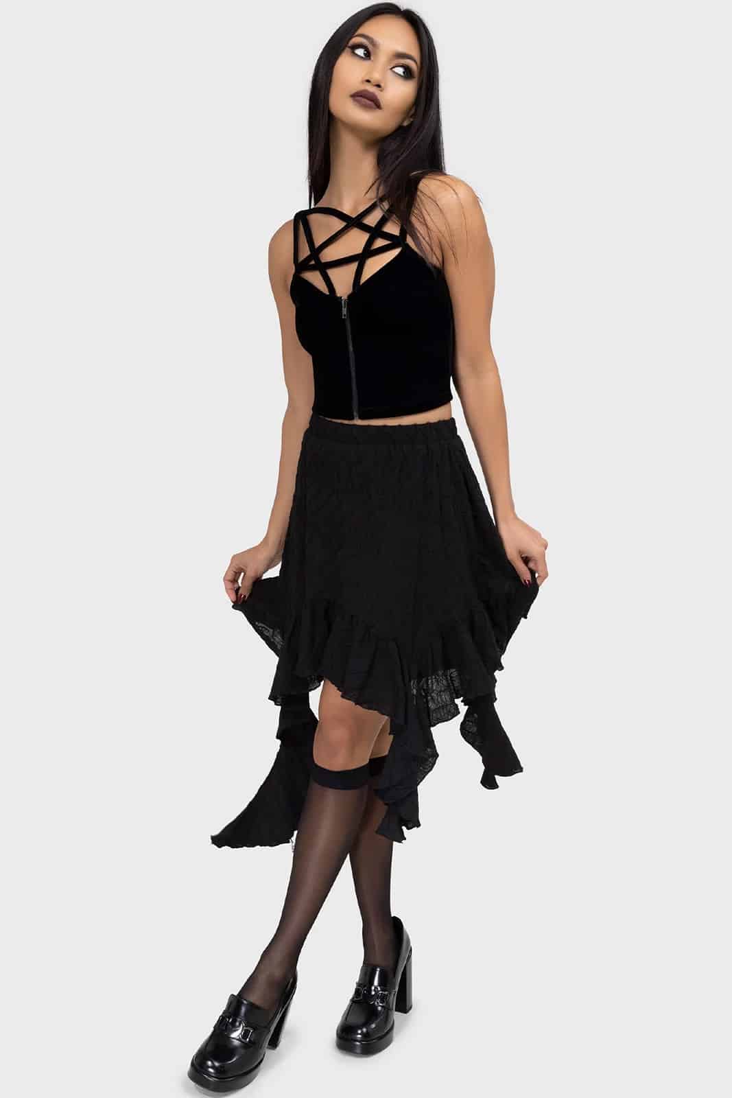 Ein Tanz aus Schatten und Wind – dieser verspielte Minirock aus weichem, strukturiertem Jersey umhüllt dich mit leichter Unruhe. Der ungleichmäßig verlängerte Saum fällt wie zerfetzte Schleier einer alten Prophezeiung und schwingt geheimnisvoll bei jeder Bewegung mit. Der elastische Bund schenkt Komfort, der lockere Schnitt Freiheit. Ein Rock wie gemacht für nächtliche Rituale – verspielt, wild, verzaubert.