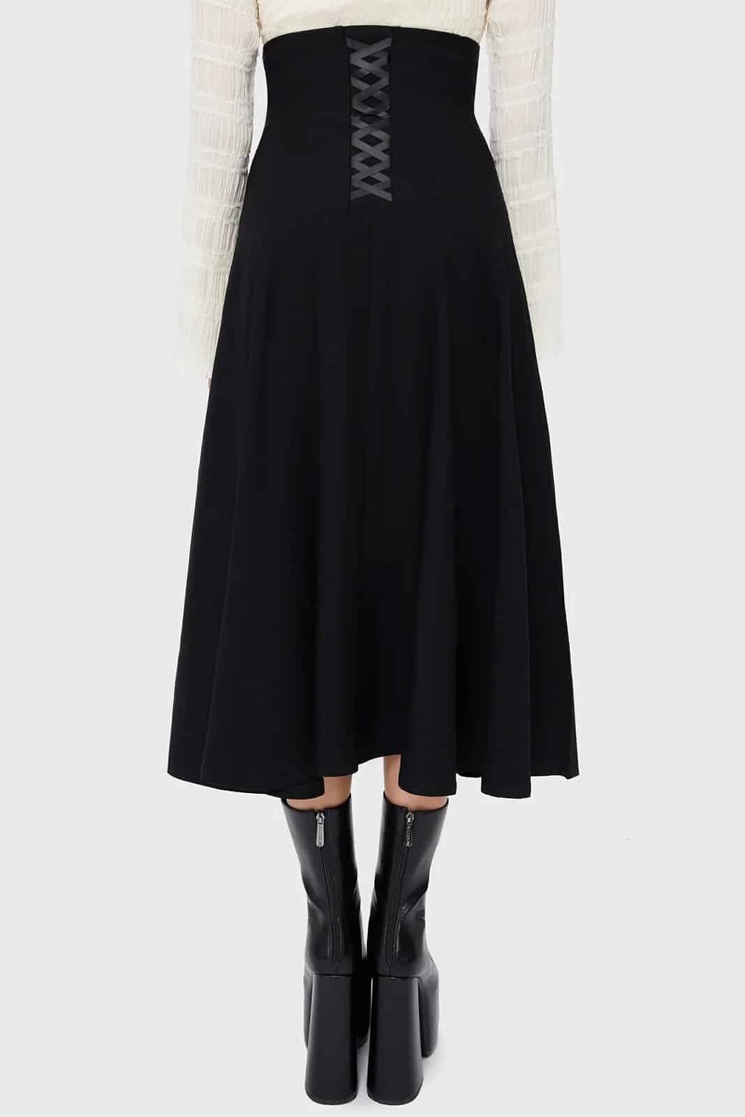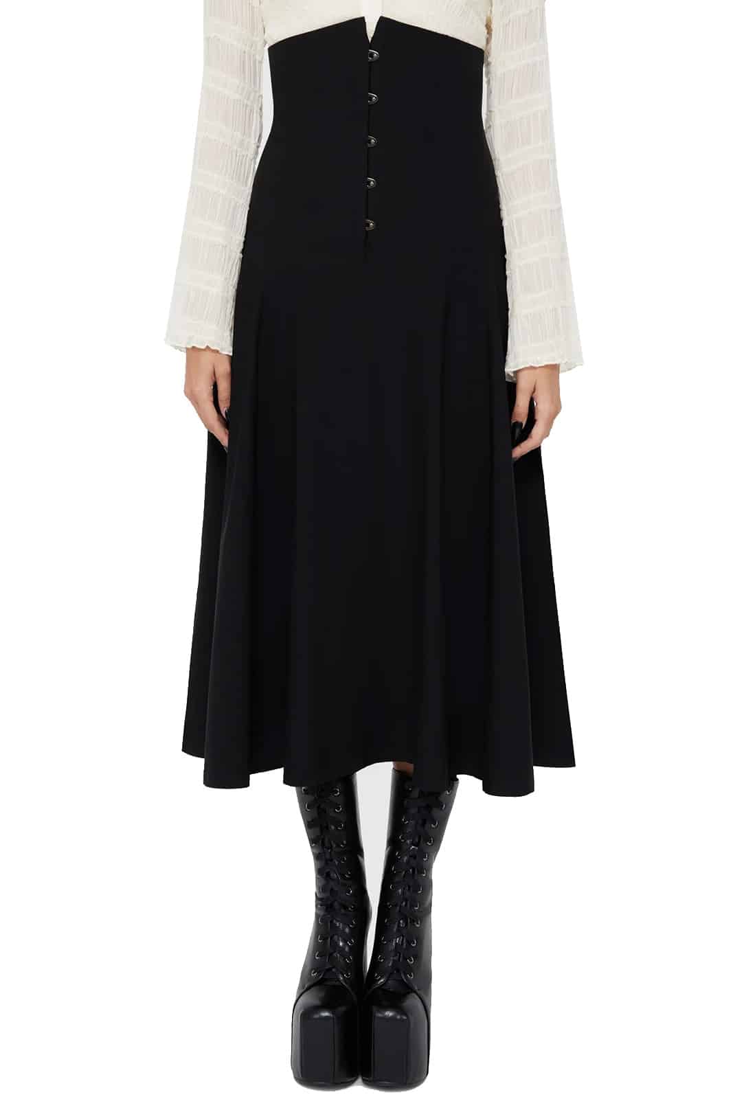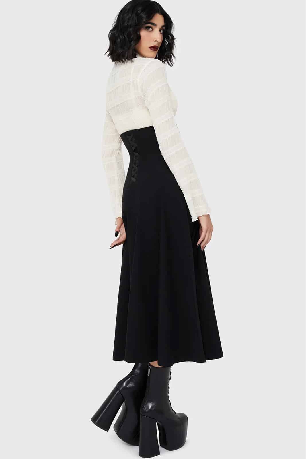 Dieser edle Midirock vereint feminine Eleganz mit dunkler Sinnlichkeit. Die taillenhohe Korsettpartie mit Knopfleiste formt eine schmeichelnde Silhouette und verleiht jedem Outfit einen Hauch von Vintage-Drama. Der fließende Rock schwingt bei jeder Bewegung leicht mit, während die feste Schnürung im Rücken für einen perfekten Sitz sorgt. Ein Stück, das klassische Romantik mit moderner Gothic-Ästhetik verbindet – ideal für Abendanlässe, Feste oder mondhelle Nächte.