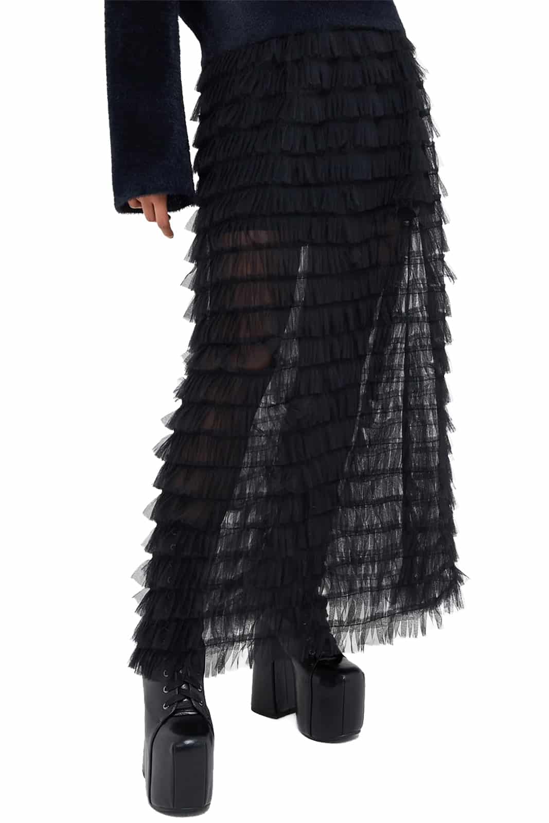 Ein dramatischer Maxi-Rock aus zartem, transparentem Tüll, der mit seinen mehrlagigen Rüschen für eine opulente Silhouette sorgt. Die fließenden Stufen verleihen deinem Look viktorianische Eleganz mit modernem Gothic-Flair – perfekt für besondere Anlässe, dunkle Events oder als ausdrucksstarkes Statement im Alltag.