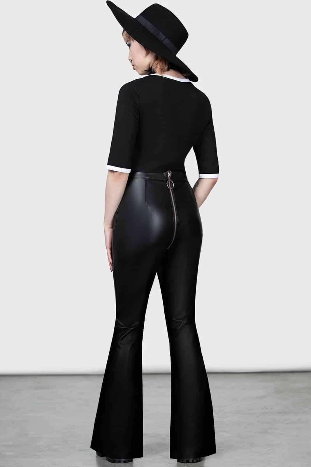 Direkt vom Schneidetisch der Dämonen kommt eine hochwertige Schlaghose aus dickem, nicht dehnbarem Kunstleder. Die schwarze Farbe ist extrem matt und verschlingt jegliches Licht. Ein Statement-Reißverschluß im doppelseitigem Stil ist mit einem O-Ring Zipper bestückt.