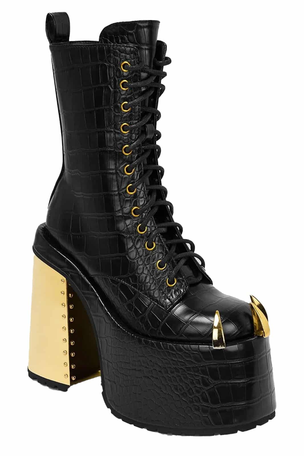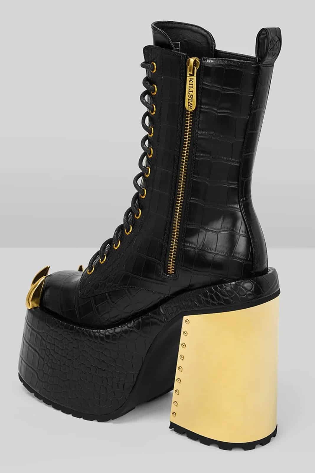 Der Absatz ist umrandet mit goldfarbenem Metall. Vorn mit Schnürung und seitlich mit goldfarbenem Reißverschluß.