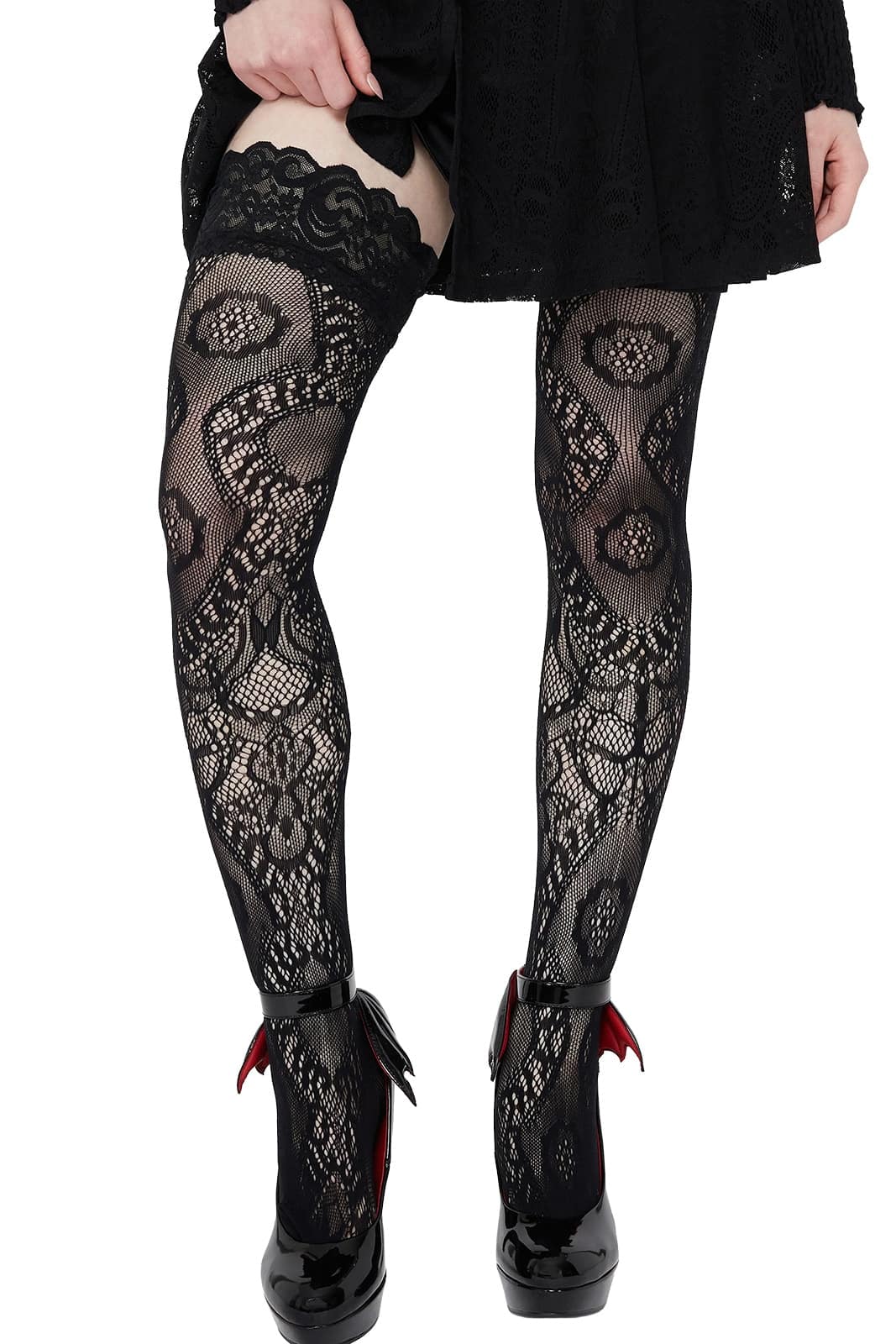 Verführerische Spitzenstrümpfe mit kunstvollem Muster und selbsthaftendem Abschluss – perfekt für elegante Gothic-Looks oder besondere Anlässe.