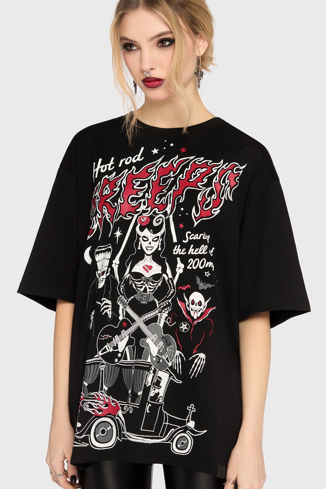 Laut, rebellisch und voller Attitüde: Das „Scaring Hell“ T-Shirt von Killstar bringt mit seinem auffälligen Rockabilly-inspirierten Artwork eine explosive Mischung aus Horror, Retro und Punk in deinen Look. Der lockere Boxy Fit sorgt für maximalen Komfort und einen entspannten Style.