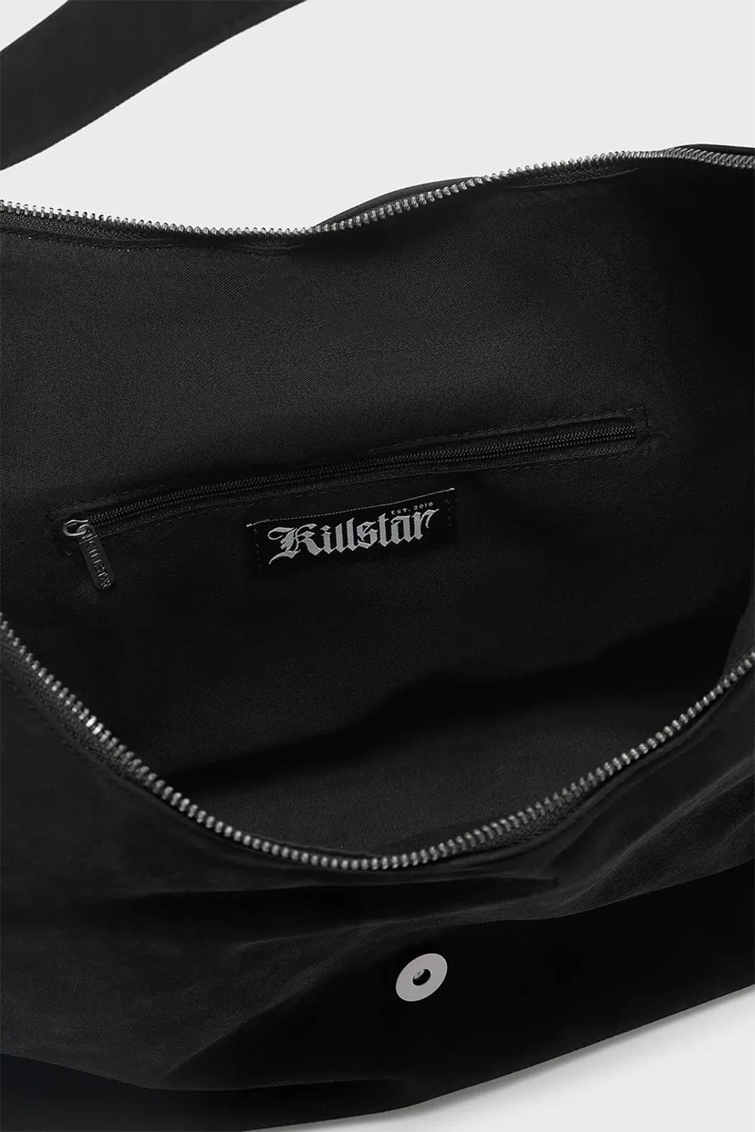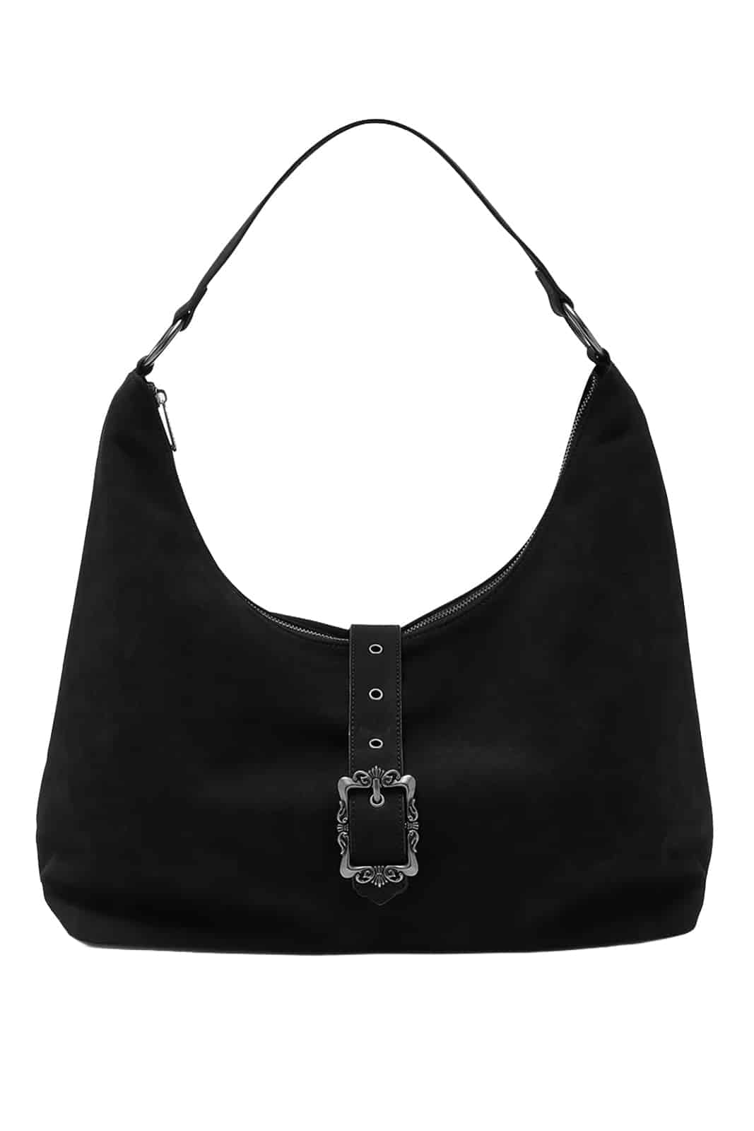 Eine lässig fallende Schultertasche mit weicher, sueder PU-Oberfläche und markanter Silhouette. Die auffällige Zierschnalle in Silberoptik setzt ein starkes Statement, während der lockere Hobo-Style genug Platz für deine Essentials bietet. Teil der Nocturne Nights Linie – dunkle Eleganz mit metallischem Glanz, die jedem Outfit eine geheimnisvolle, edle Note verleiht.