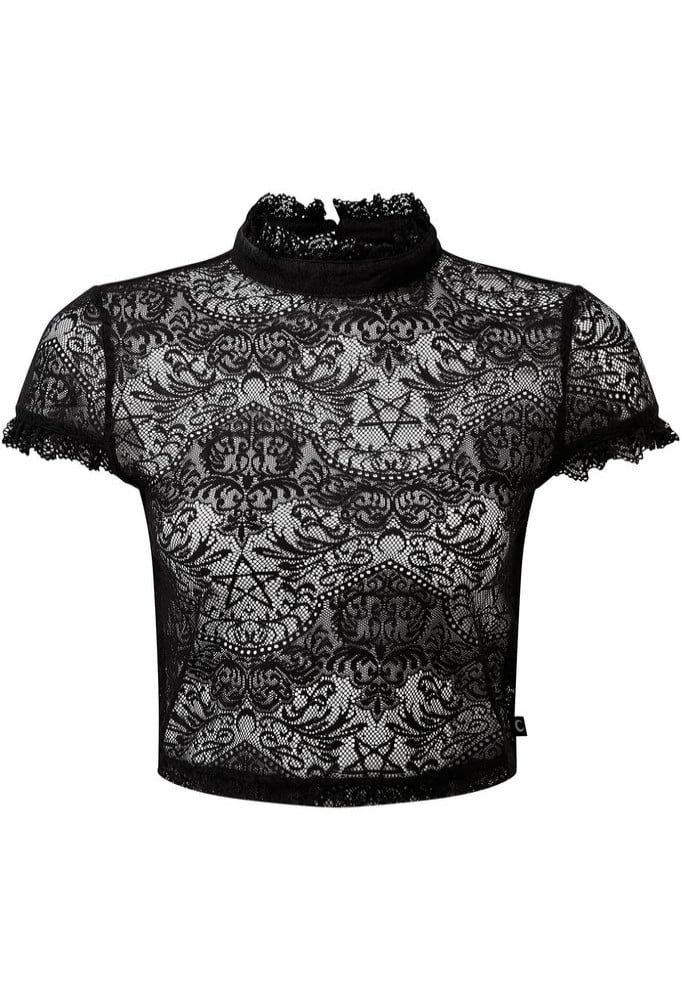 Kurz geschnittenes Gothic Top aus luftiger Spitze mit Pentagrammen und foralen Motiven. Mit kurzen Ärmeln, Stehkragen und feinen Rüschen.