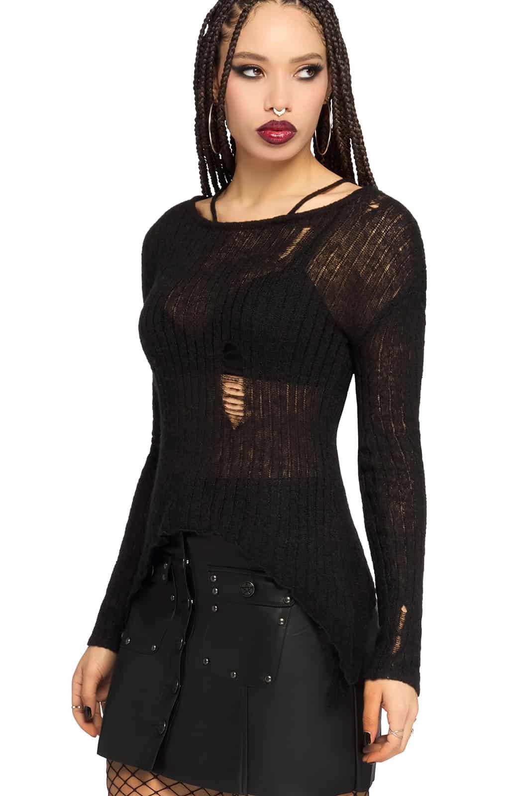 Zerbrechlich und doch ausdrucksstark – das Haunting Echoes Top spielt mit Transparenz, Struktur und bewusst gesetzten Destroyed-Details. Der leichte, offene Strick umhüllt dich wie ein flüchtiger Schatten und verleiht deinem Look eine geheimnisvolle, unperfekte Ästhetik.