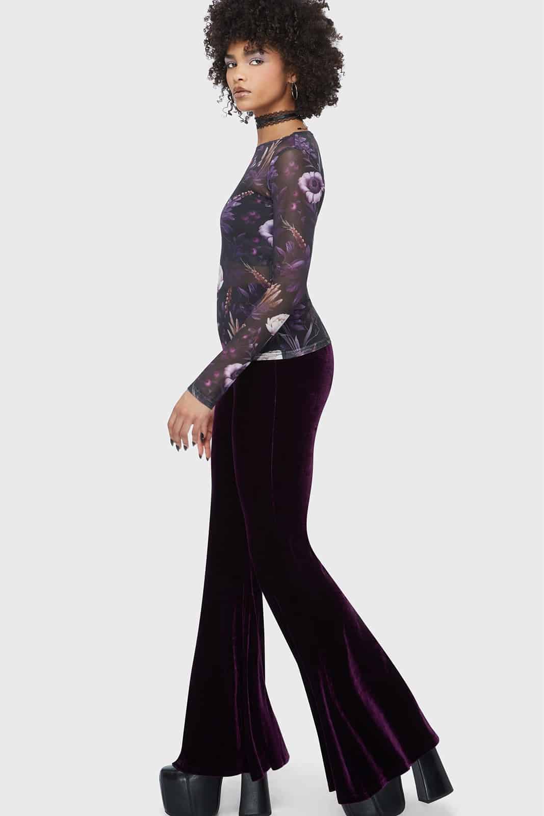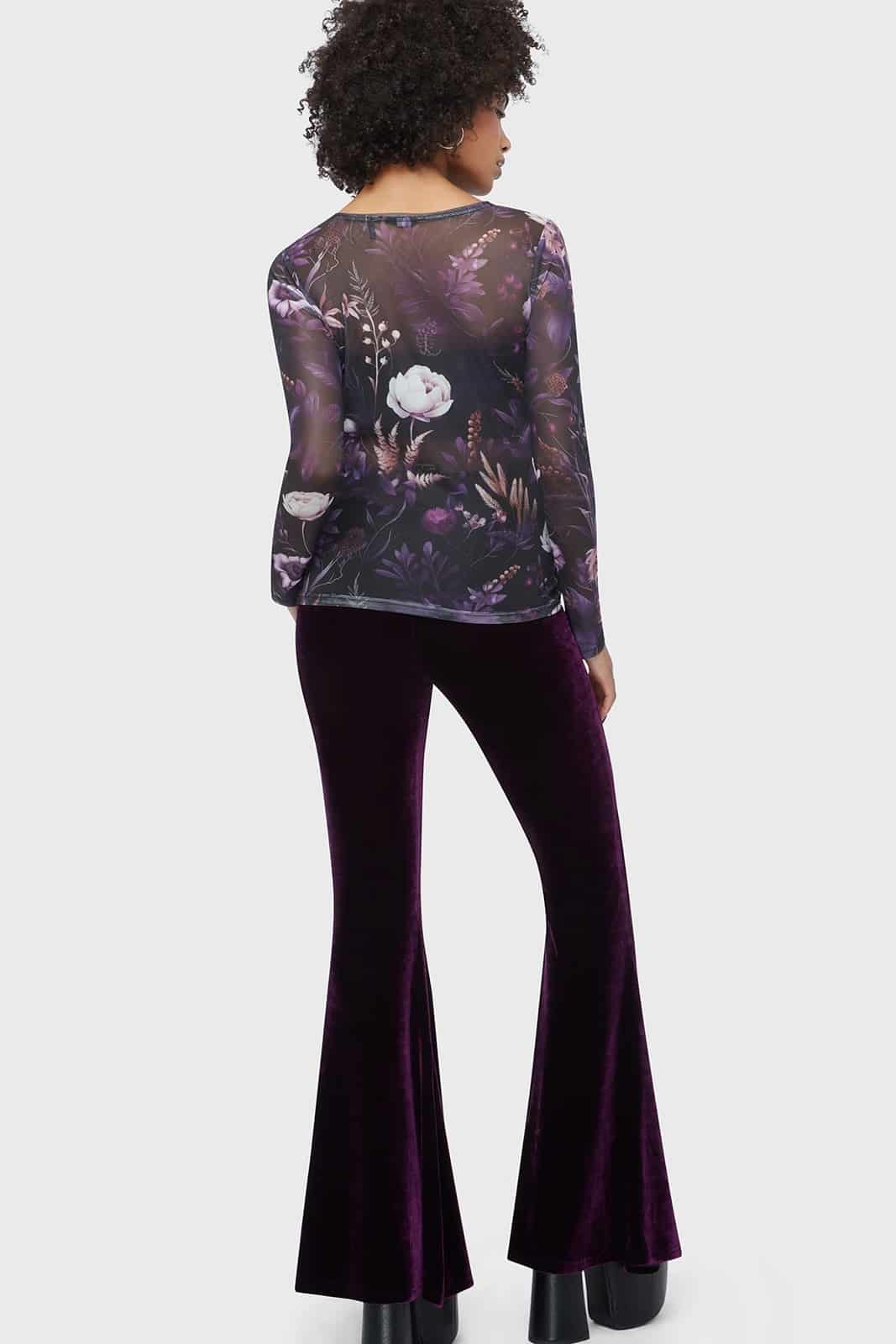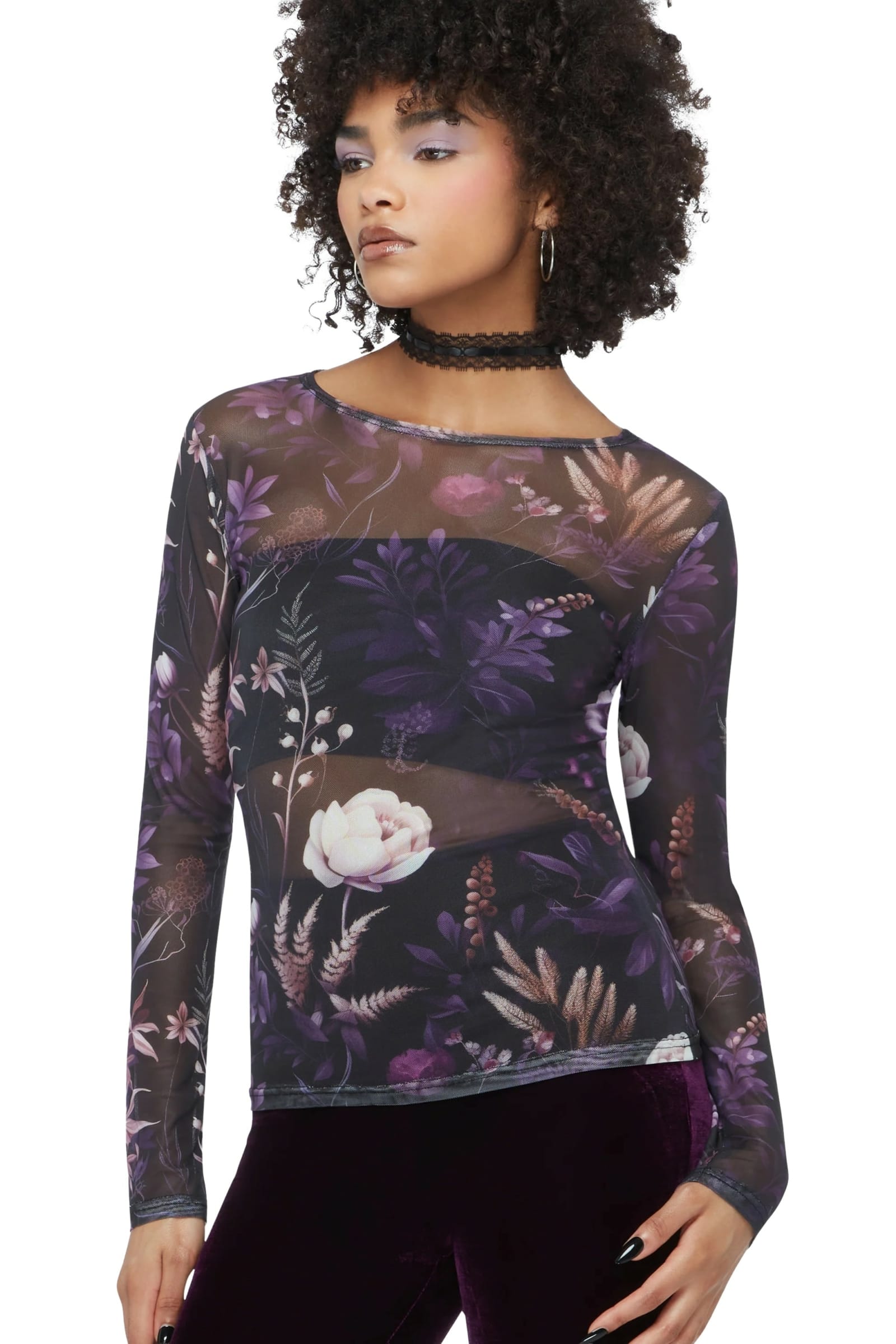 Dieses transparente Langarmshirt vereint florale Eleganz mit dunkler Raffinesse. Das feine Mesh mit detailreichem Blumenprint legt sich figurbetont an und wirkt sowohl solo als auch im Layering besonders ausdrucksstark. Ein vielseitiges Statement-Piece für Gothic-, Dark-Boho- und Alternative-Looks.
