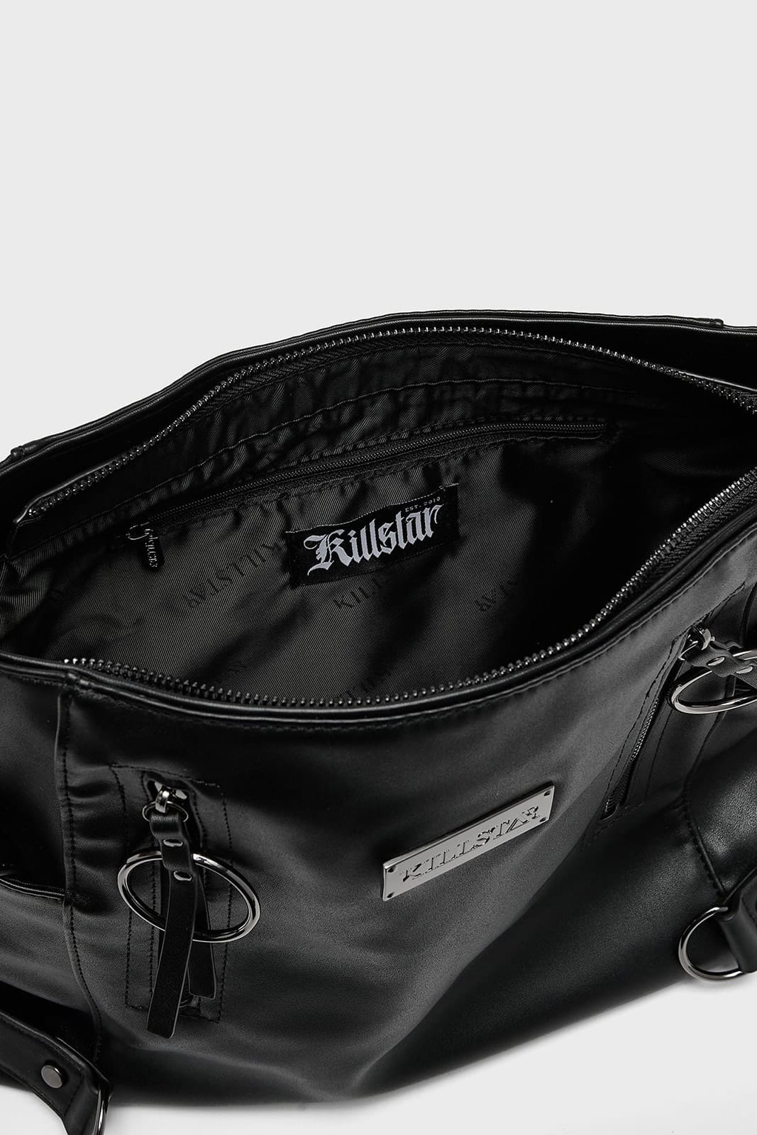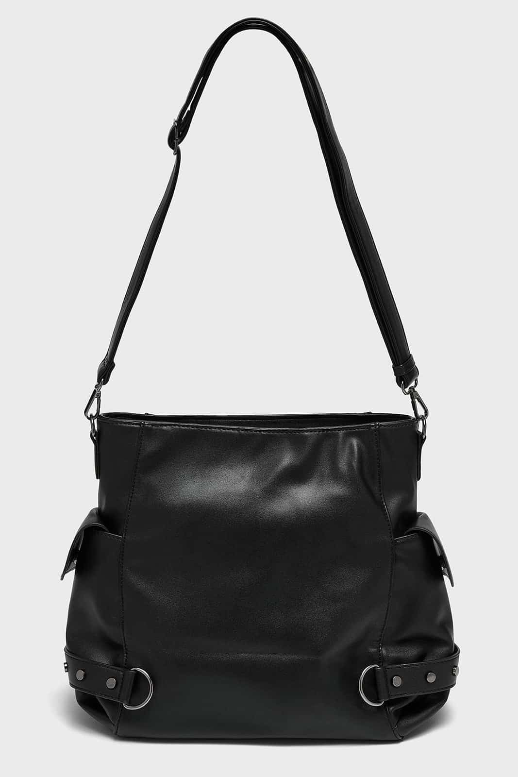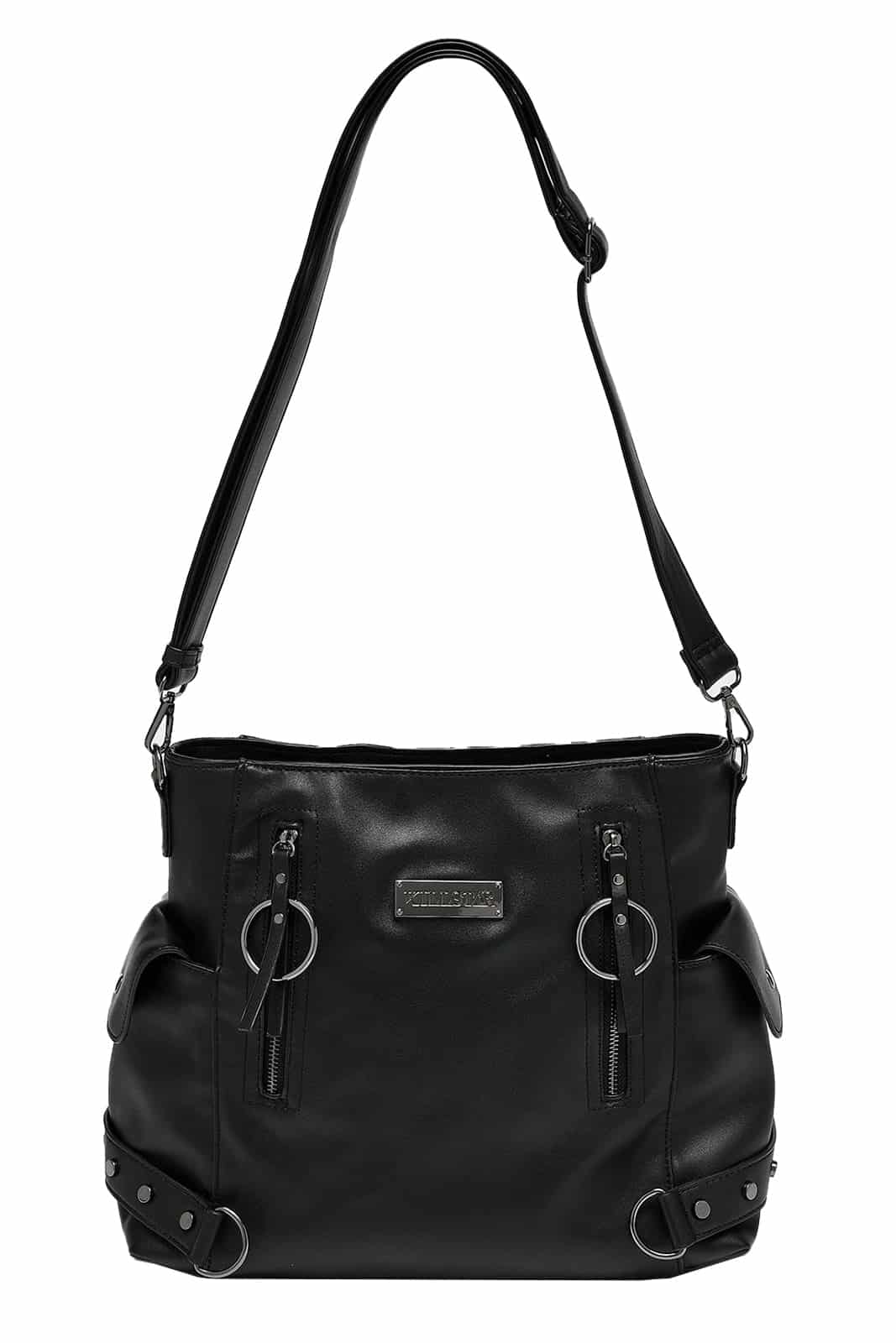 Geräumige Gothic-Tasche aus glattem Kunstleder mit verstellbarem und abnehmarem Schultergurt. Innen vollständig gefüttert und mit mehreren Innentaschen versehen, teils mit Reißverschluß. Verschlossen wird die Tasche mit einem Reißverschluss.