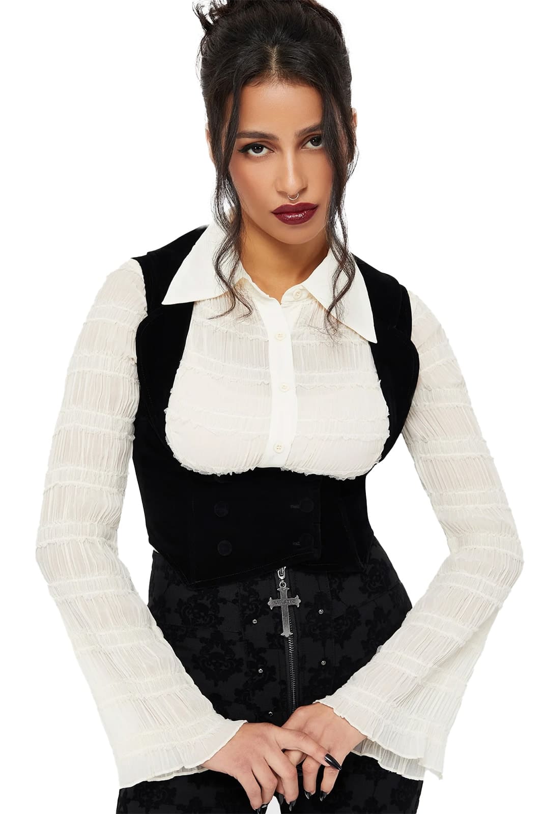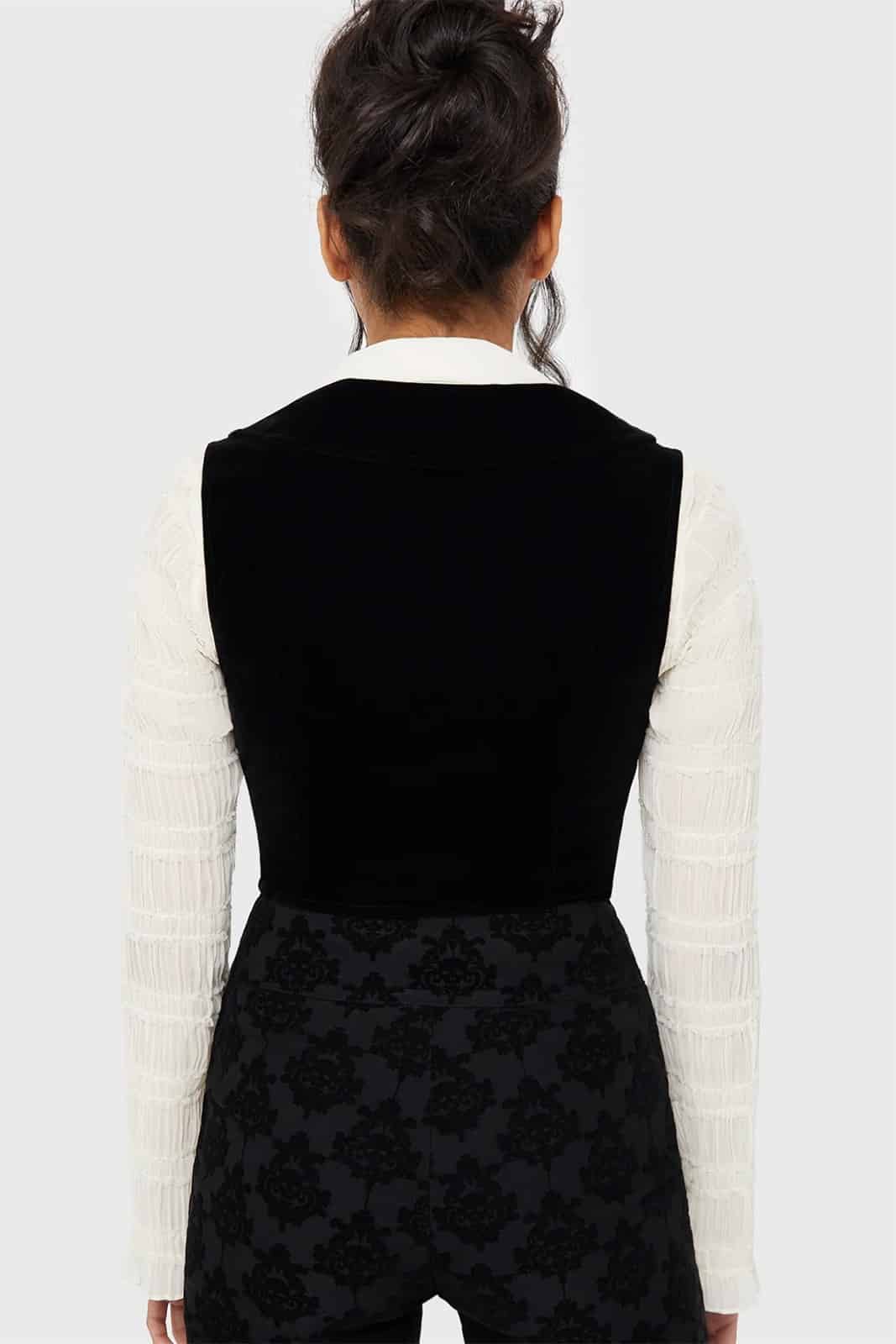 Ein weiches, samtiges Unterbrust-Westelet, das Outfits sofort eine elegante viktorianische Note verleiht. Die doppelte Knopfleiste und der runde Kragen sorgen für eine klare, edle Form. Entstanden in Zusammenarbeit mit Freyja von Its Black Friday und perfekt für Layering über Blusen und Kleider.