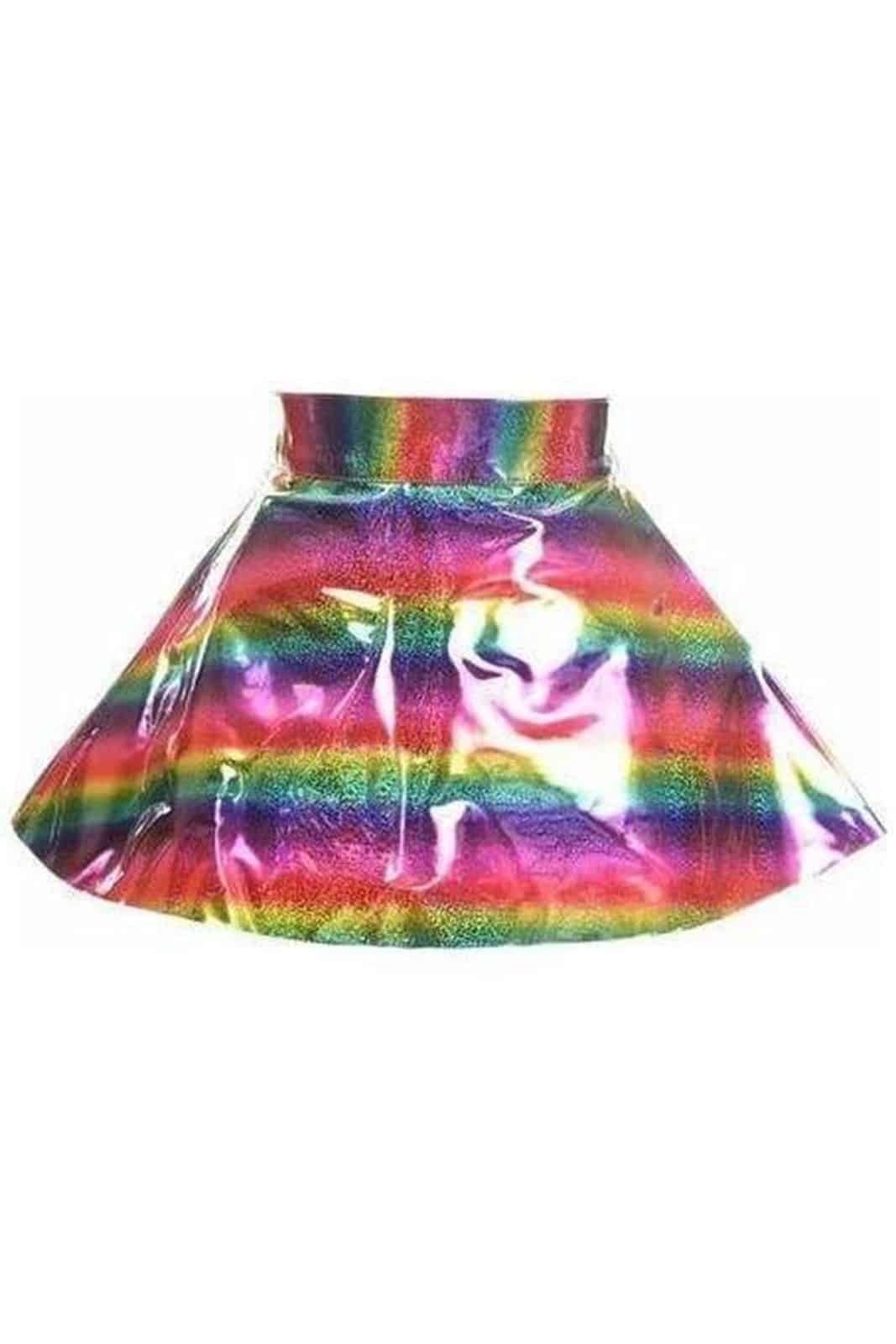Dieser Skaterrock setzt ein starkes Statement mit seiner schimmernden Oberfläche in intensiven Regenbogenfarben. Das holografische Finish reflektiert das Licht aus jedem Winkel und macht den Rock zum perfekten Piece für Festivals, Raves oder auffällige Alternative-Looks. Der ausgestellte Skater-Schnitt sorgt für Dynamik und eine feminine Silhouette, während der hohe Bund den Look klar definiert.