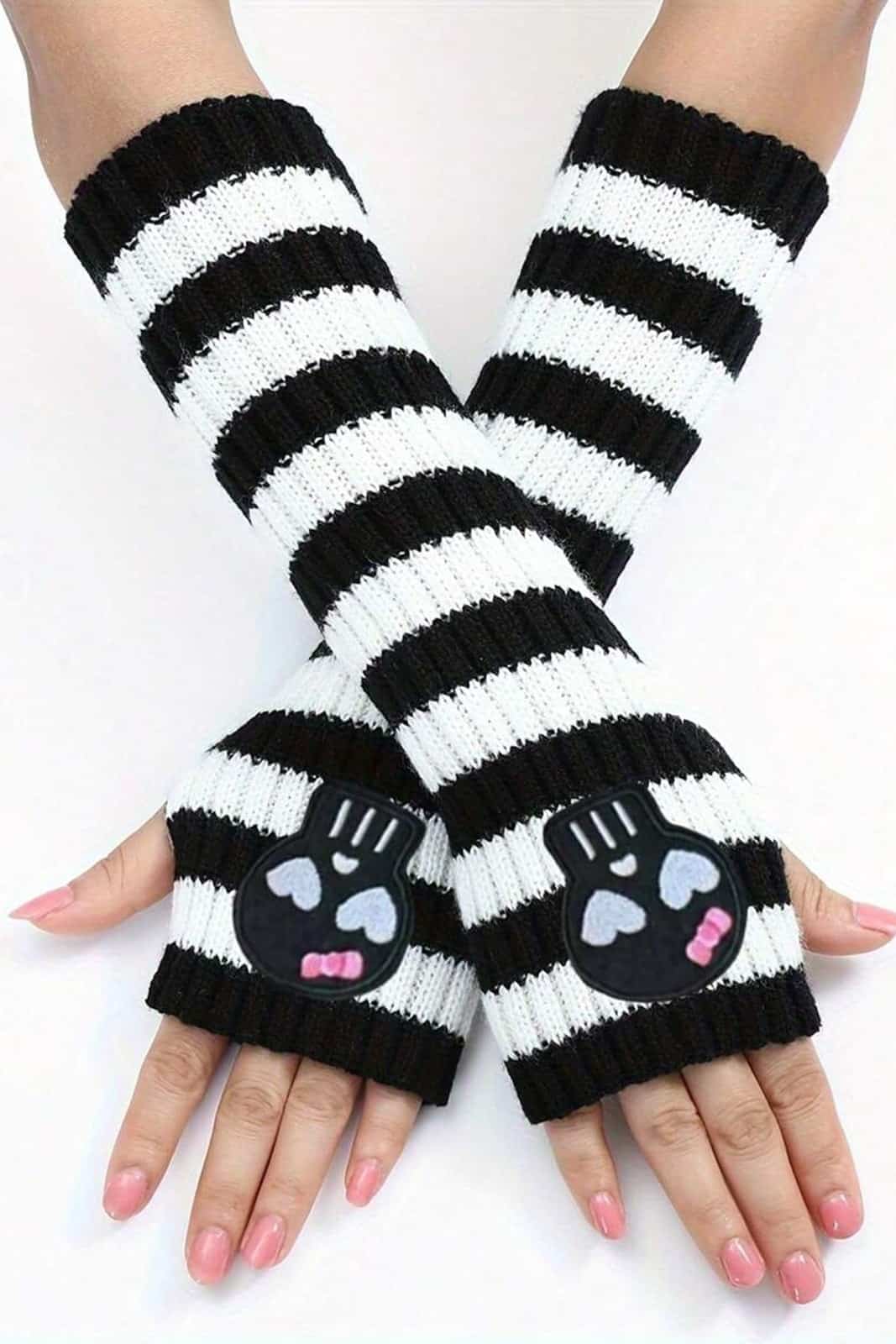 Gestreifte Armstulpen im Grobstrick mit Daumenloch und süßen Patch auf dem Handrücken.