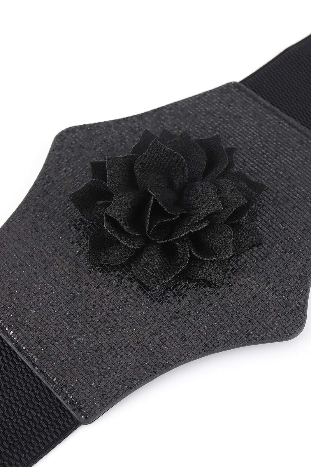 Bodice belt made of high quality faux leather with glittering coating. In the center is firmly attached black rose flower made of fabric. With an elasticated band and four press studs at the back.