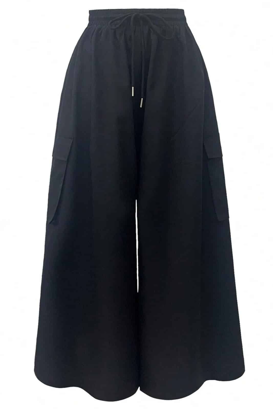Weit geschnittene Damenhose mit elastischem Bund und Kordelzug für maximalen Komfort. Seitliche Cargotaschen verleihen dem minimalistischen Design eine urbane Utility-Note, während die fließende Silhouette an einen Rock erinnert. Ideal für Streetwear, alternative Looks oder als markantes Gothic-Basic – bequem, modern und vielseitig kombinierbar.