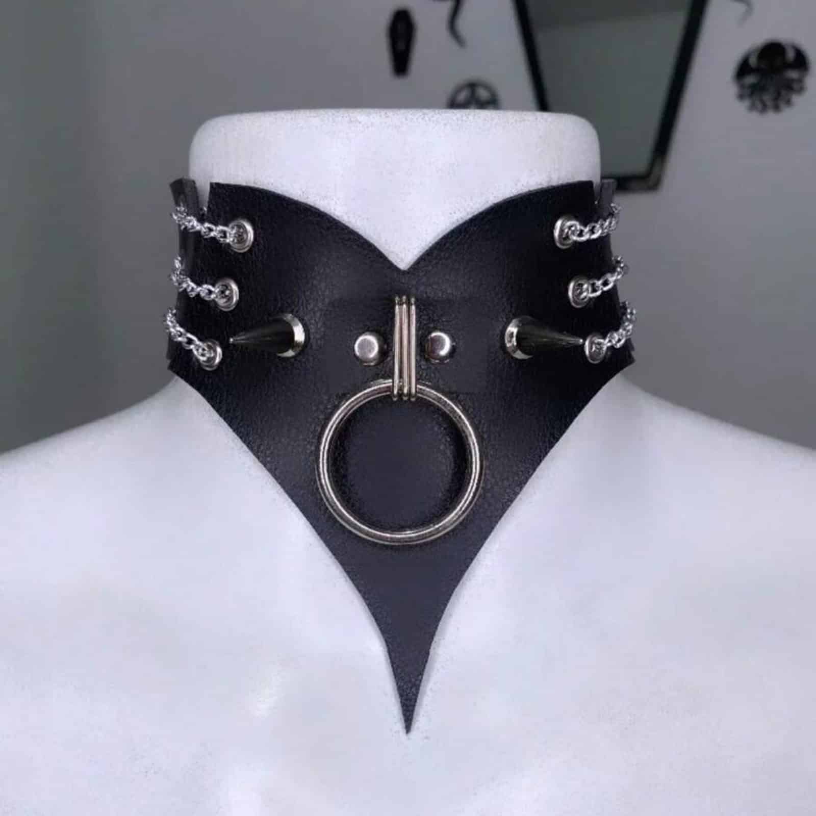 Ein Kragen wie ein dunkles Versprechen – Coven Mark vereint die Ästhetik geheimer Zirkel mit markanter Symbolkraft. Schwarzes Kunstleder formt ein tiefes V über der Brust, während silberne Ketten und Spikes wie Schutzrunen wirken. Der zentrale O-Ring wirkt wie ein Bannkreis – bereit für dein nächstes Ritual.